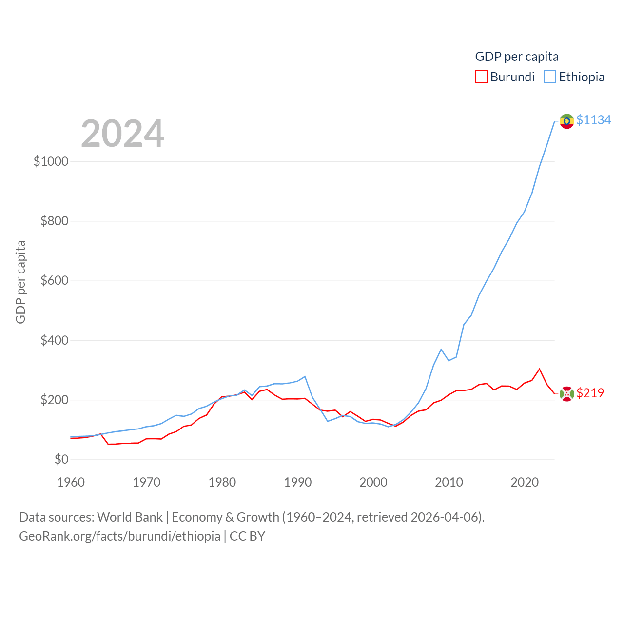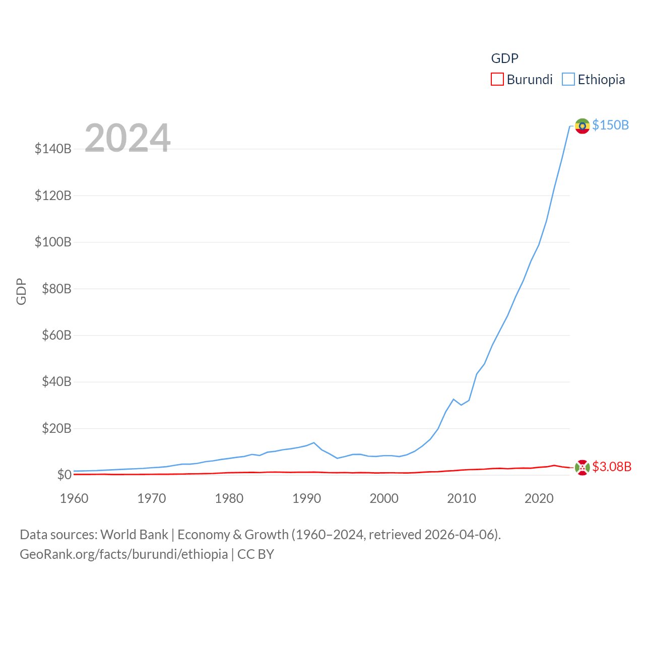 By GDP, Burundi ranks 169/197 ($3.08B) and Ethiopia ranks 60/197 ($150B). By GDP per capita, Burundi ranks 197/197 ($219.4), while Ethiopia ranks 171/197 ($1,134).