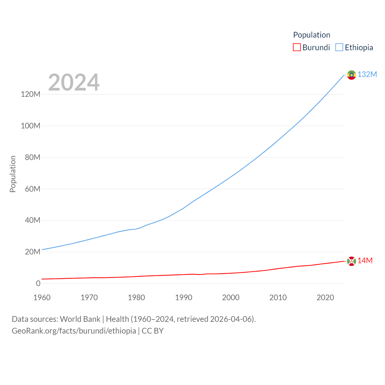 Burundi has a population of 14M (ranked 78/197), compared with 132M in Ethiopia (ranked 10/197). Burundi's land area is 9,915 sq mi versus 435,716 sq mi for Ethiopia (ranked 144th vs. 25th).