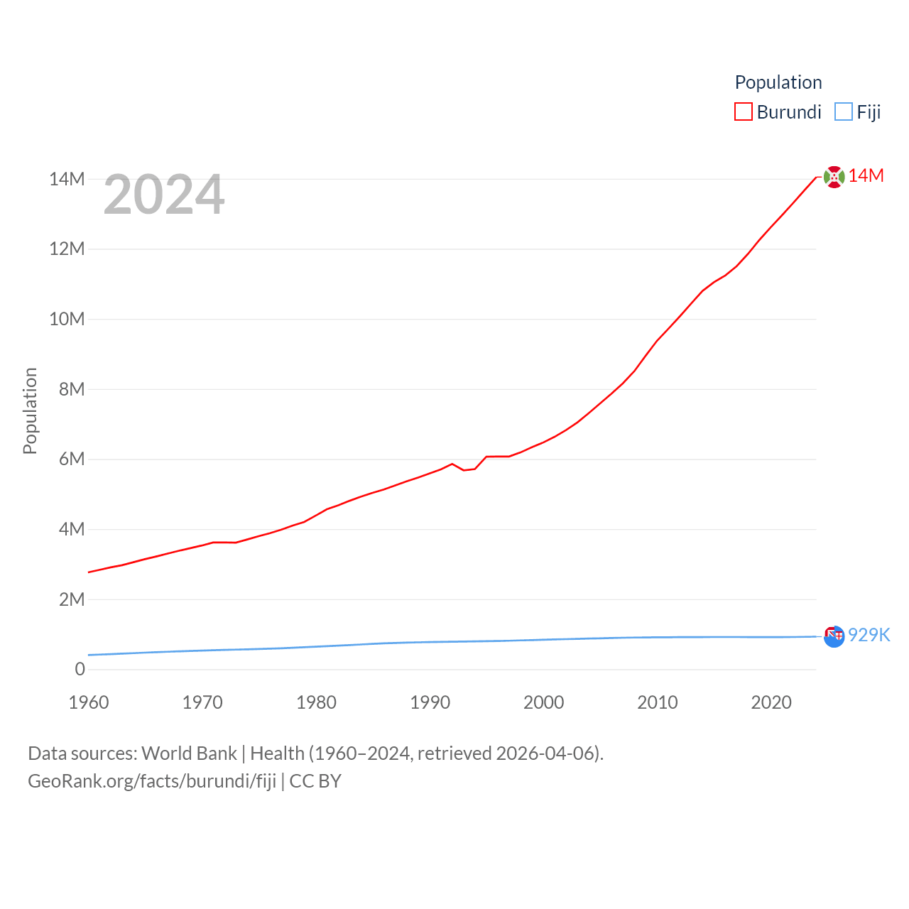 Burundi has a population of 14M (ranked 78/197), compared with 929K in Fiji (ranked 159/197). Burundi's land area is 9,915 sq mi versus 7,054 sq mi for Fiji (ranked 144th vs. 152nd).