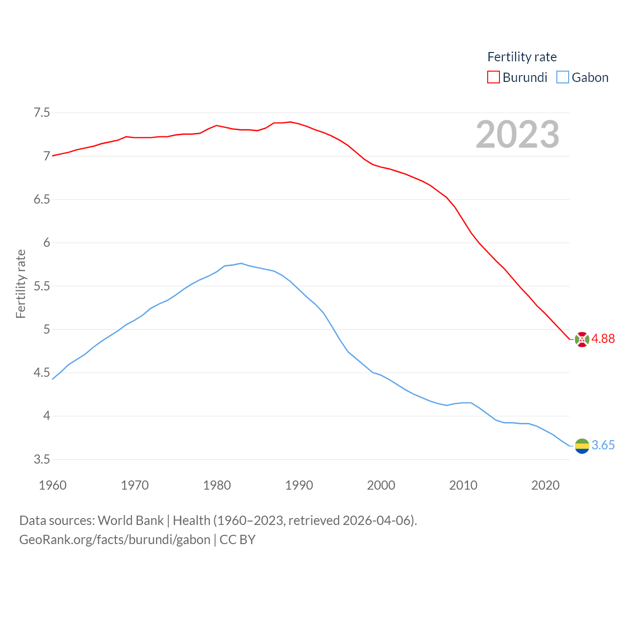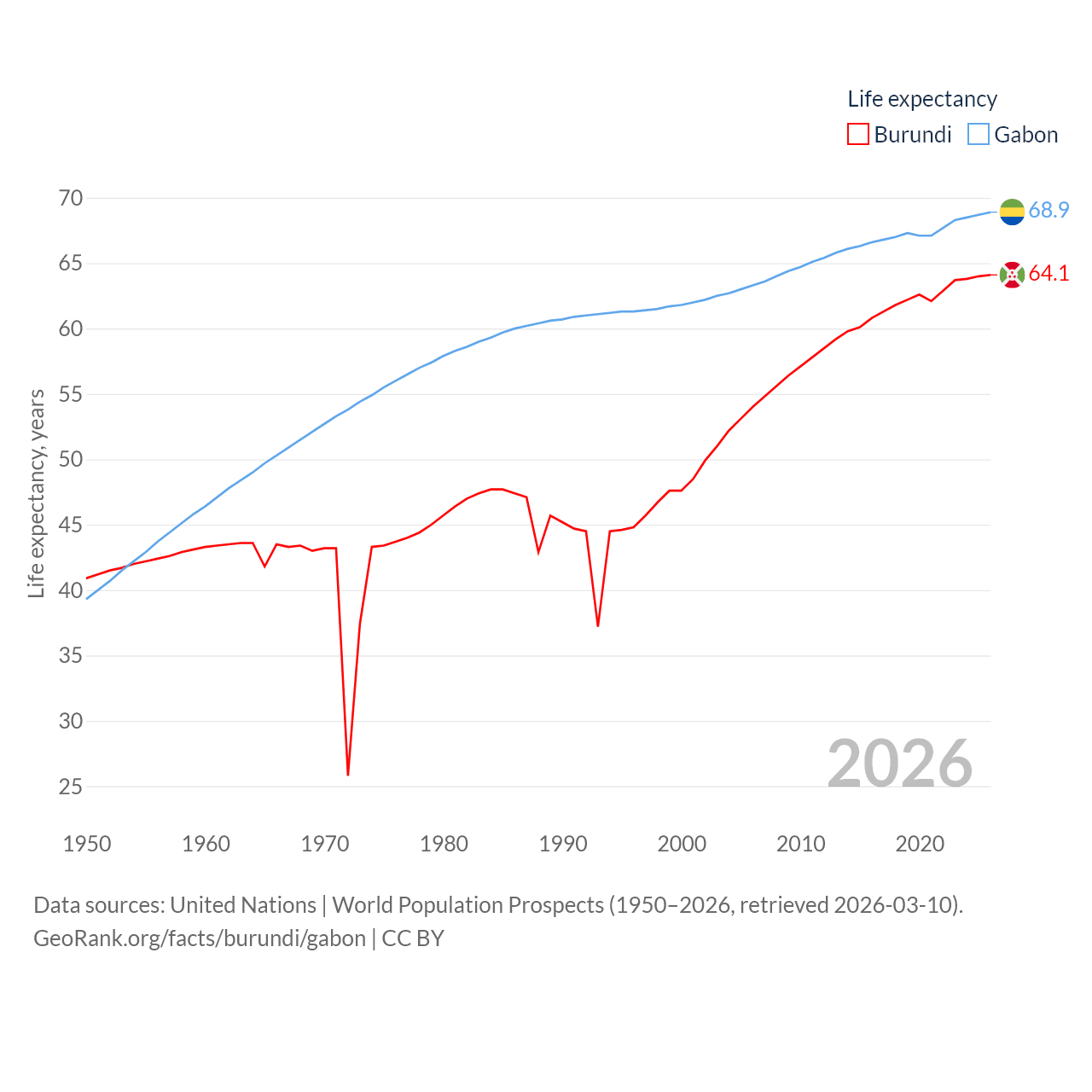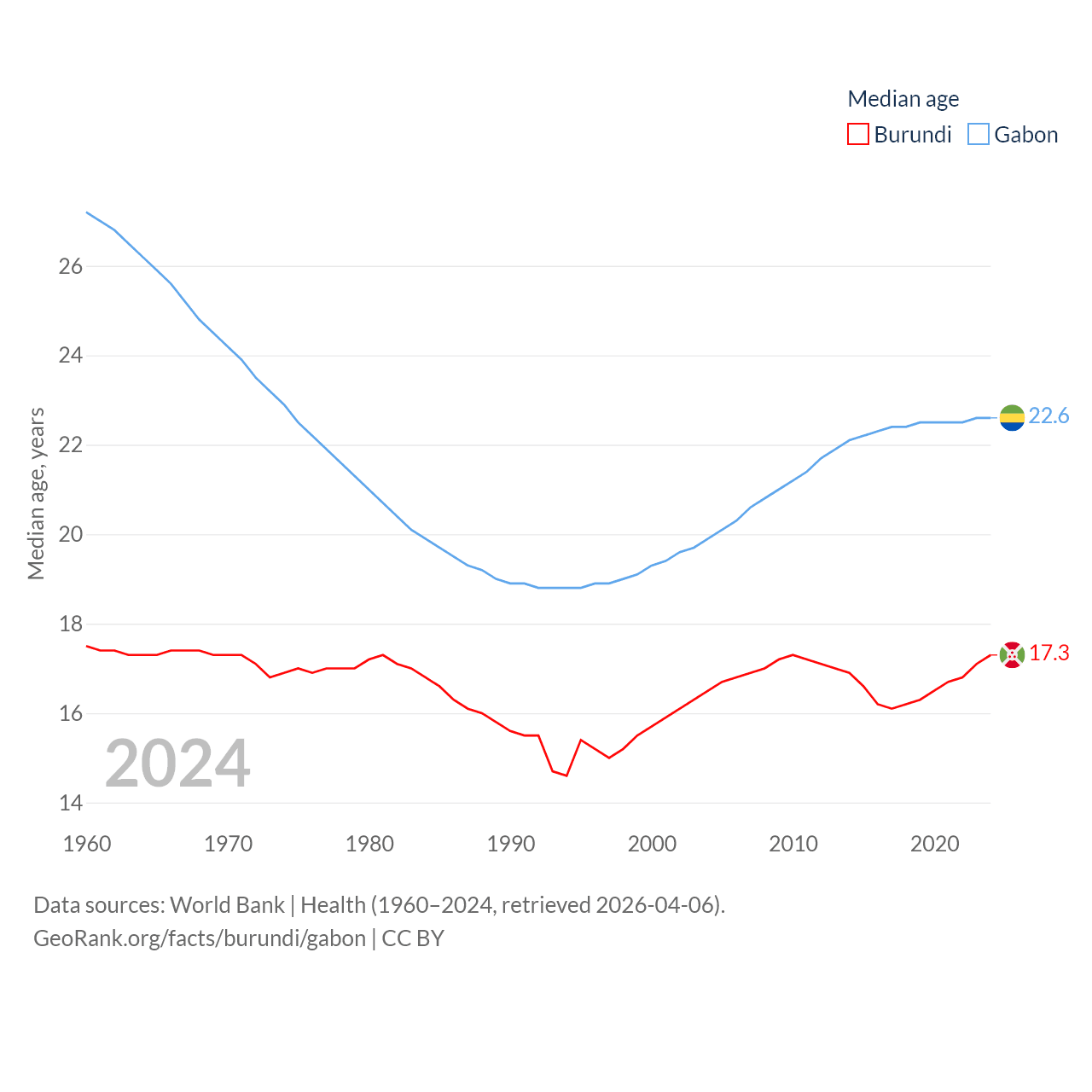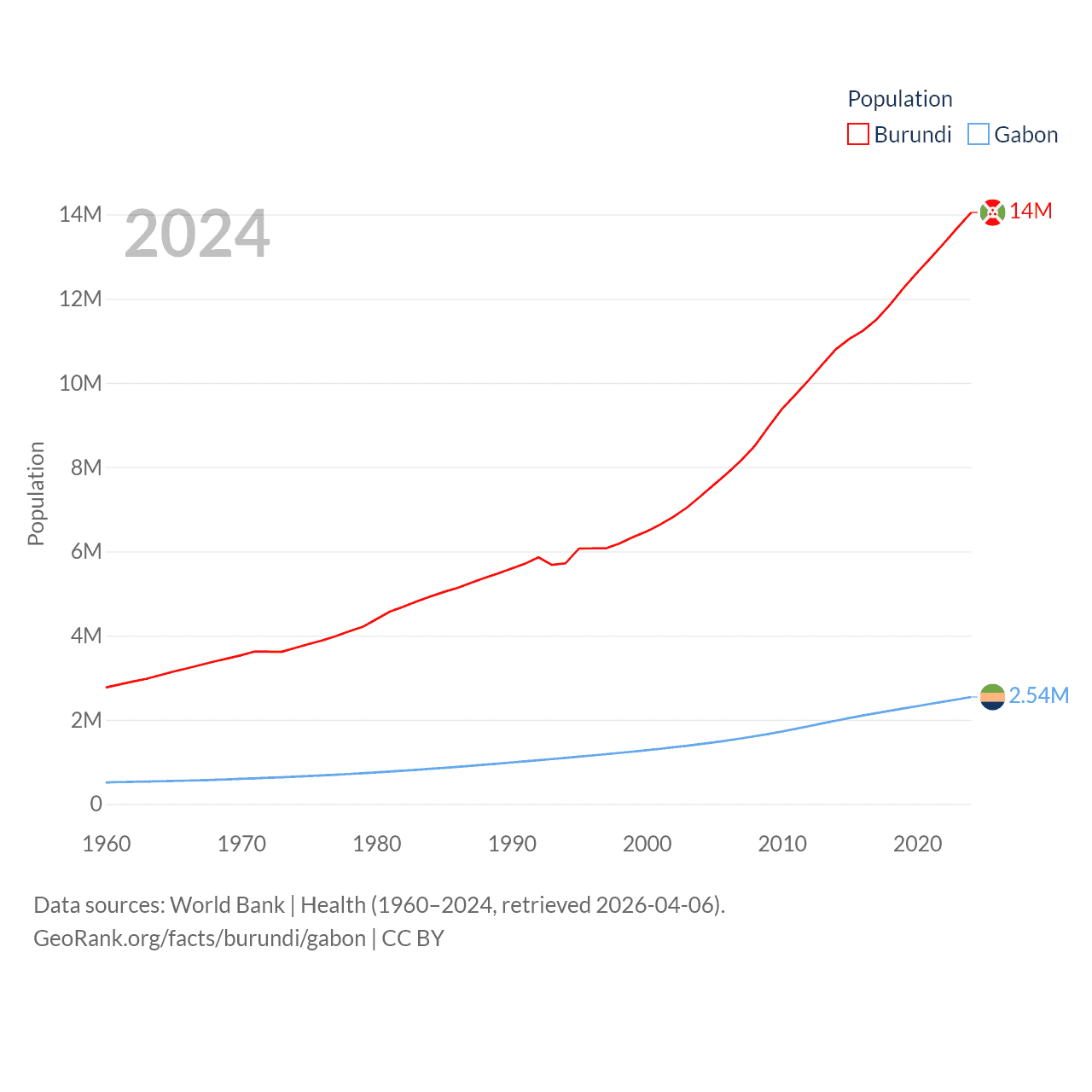 Burundi has a population of 14M (ranked 78/197), compared with 2.54M in Gabon (ranked 141/197). Burundi's land area is 9,915 sq mi versus 99,487 sq mi for Gabon (ranked 144th vs. 75th).