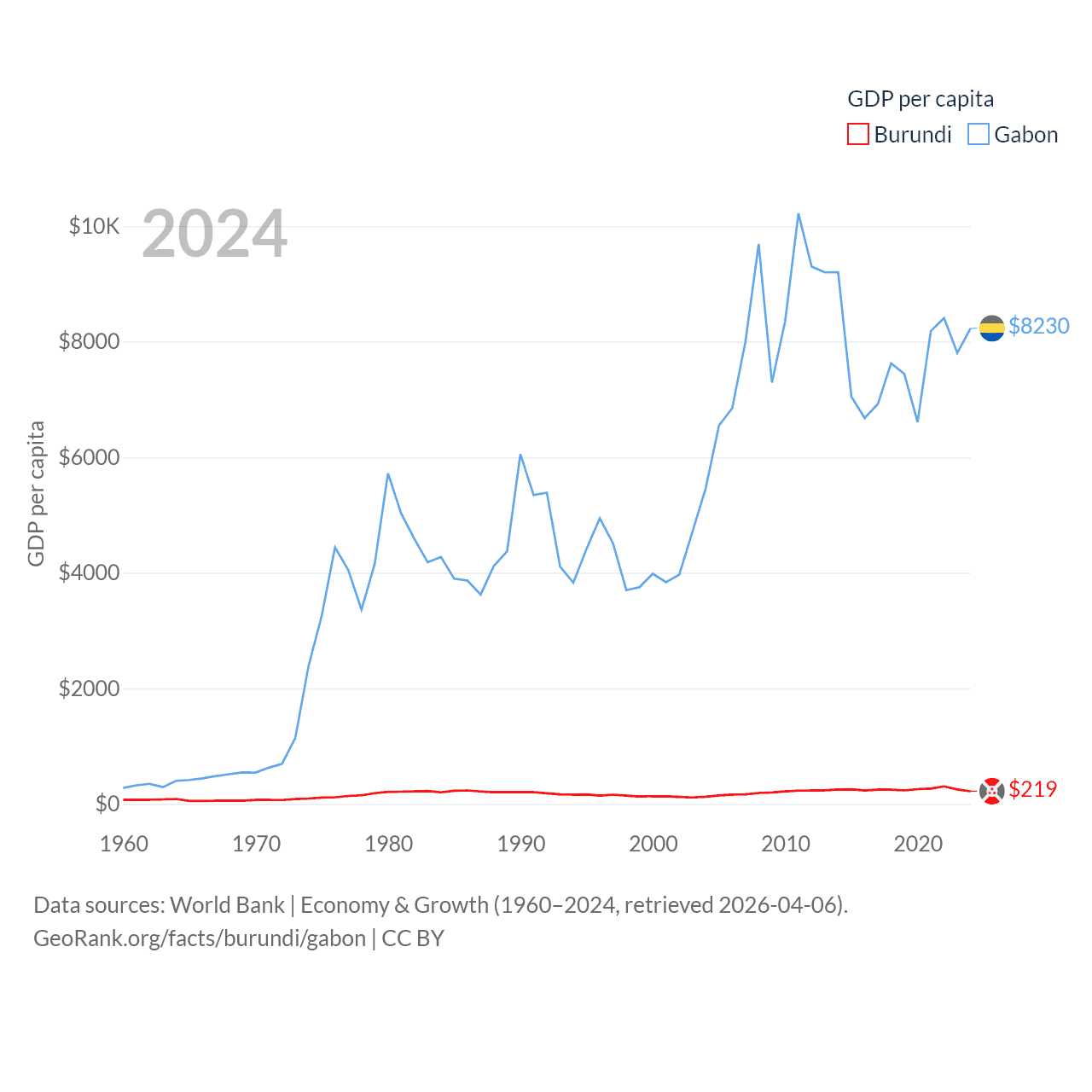 By GDP, Burundi ranks 169/197 ($3.08B) and Gabon ranks 127/197 ($20.9B). By GDP per capita, Burundi ranks 197/197 ($219.4), while Gabon ranks 93/197 ($8,230).