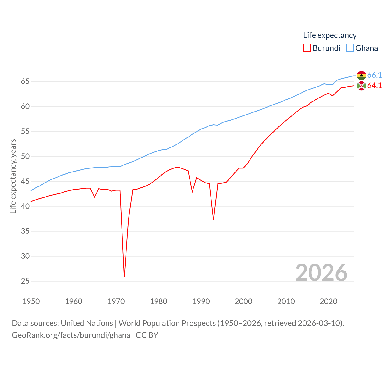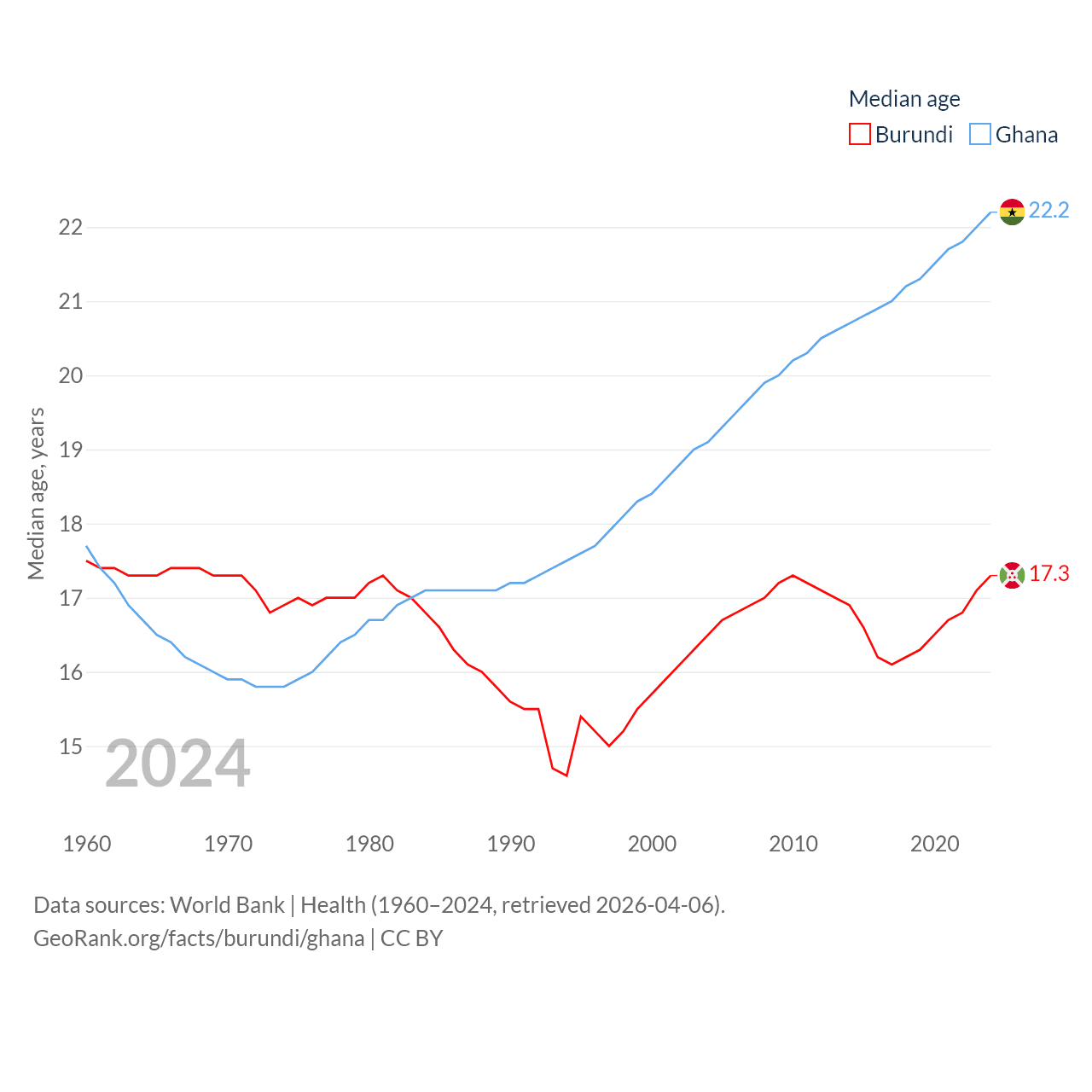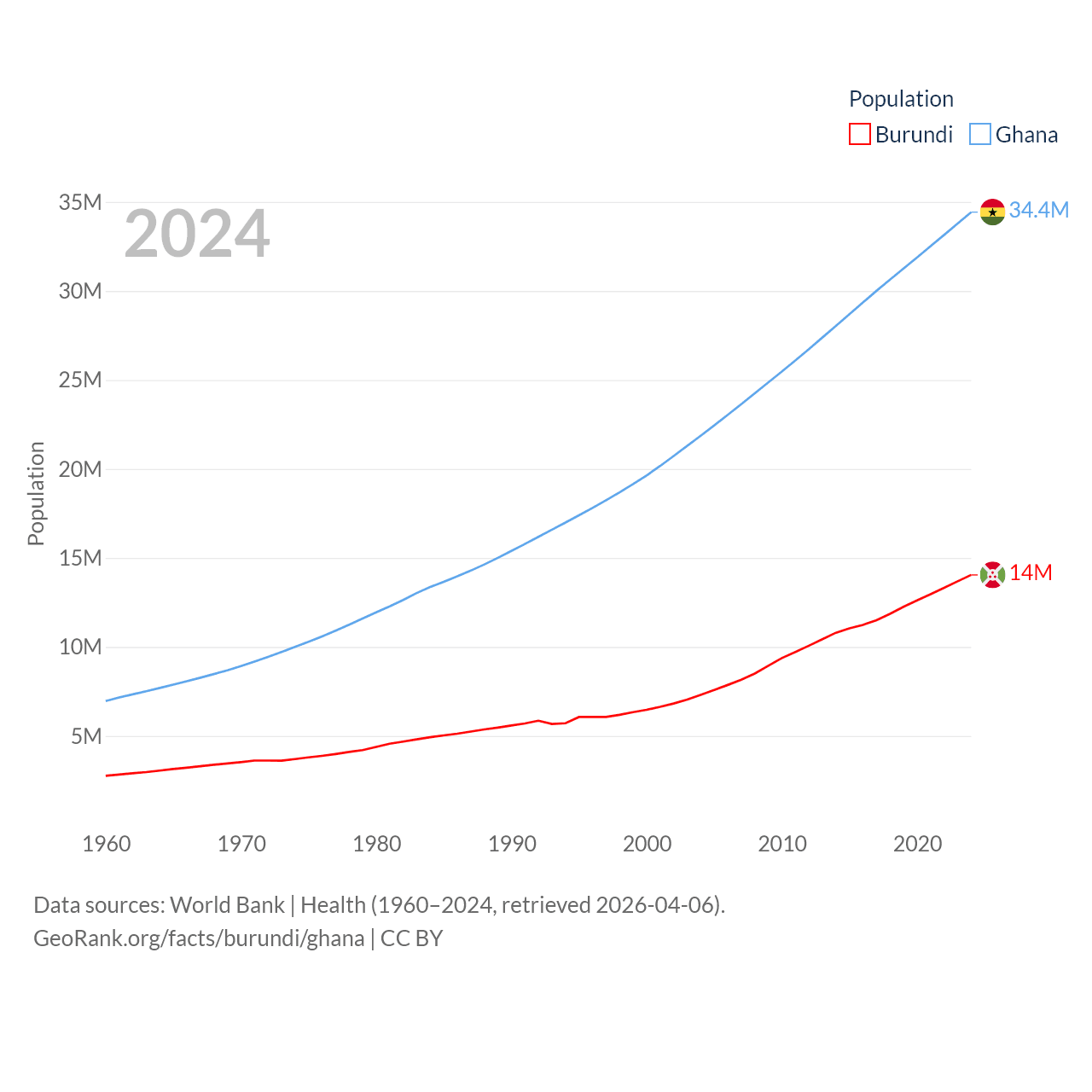 Burundi has a population of 14M (ranked 78/197), compared with 34.4M in Ghana (ranked 47/197). Burundi's land area is 9,915 sq mi versus 87,851 sq mi for Ghana (ranked 144th vs. 81st).
