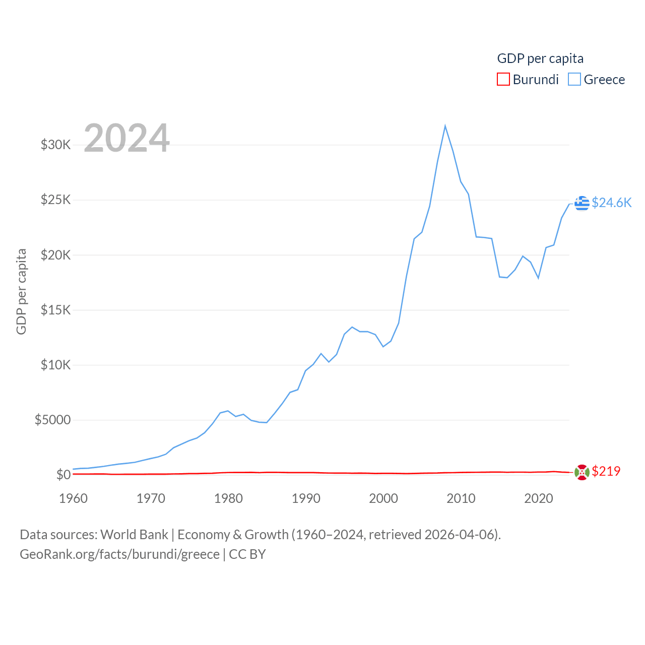 By GDP, Burundi ranks 169/197 ($3.08B) and Greece ranks 53/197 ($256B). By GDP per capita, Burundi ranks 197/197 ($219.4), while Greece ranks 49/197 ($24,626).