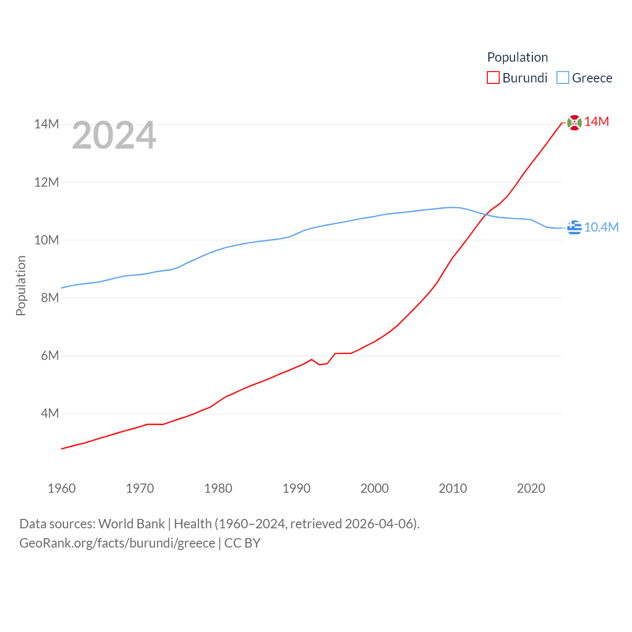 Burundi has a population of 14M (ranked 78/197), compared with 10.4M in Greece (ranked 94/197). Burundi's land area is 9,915 sq mi versus 49,769 sq mi for Greece (ranked 144th vs. 95th).
