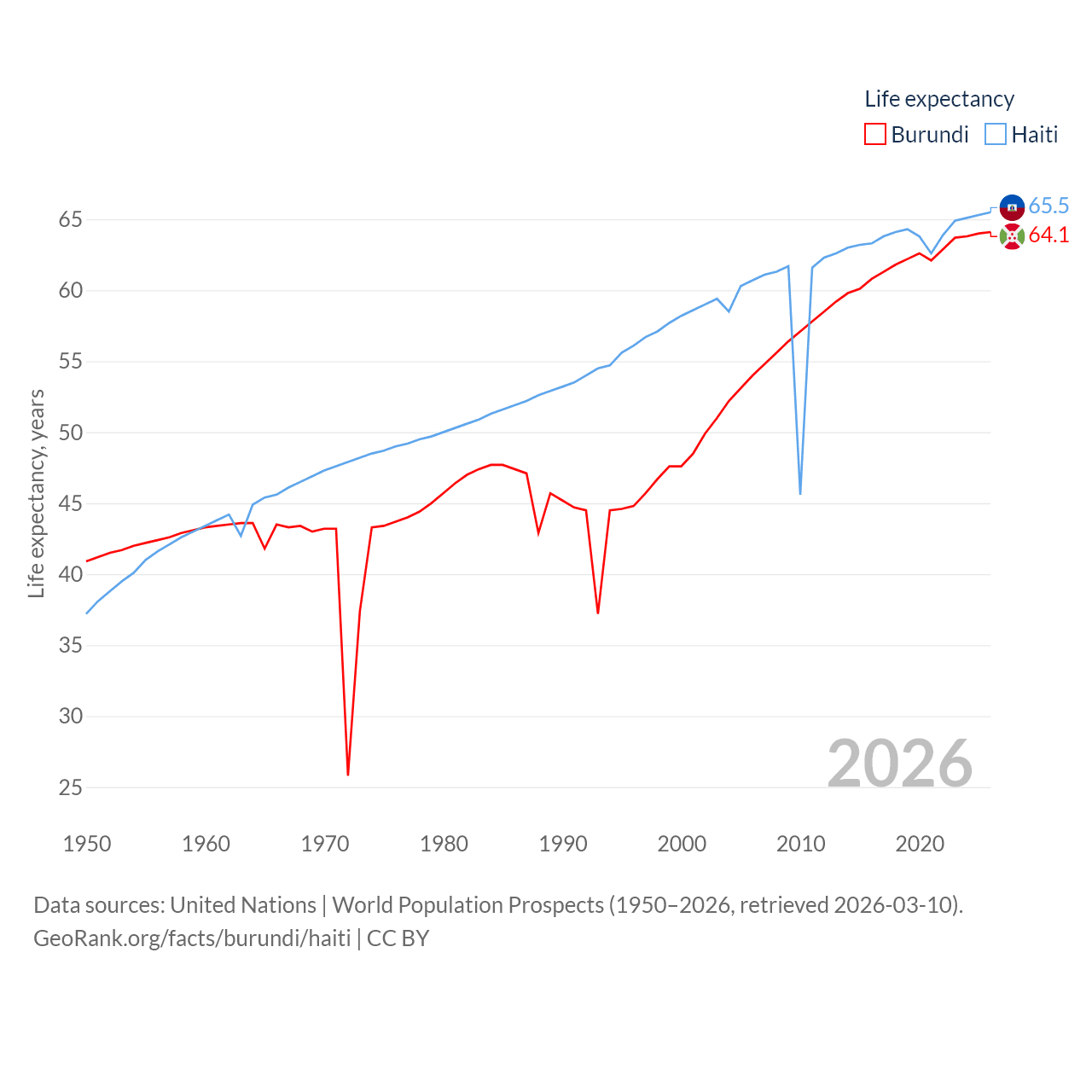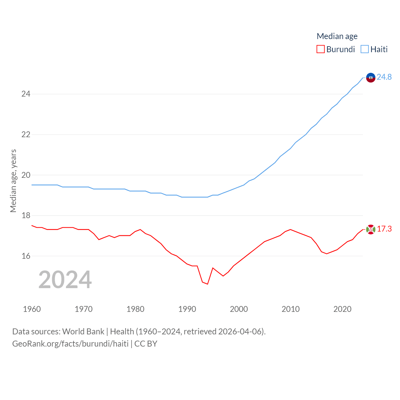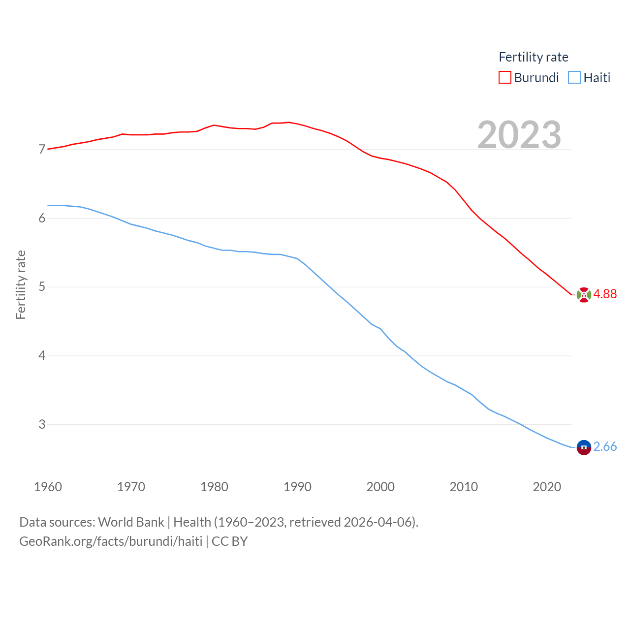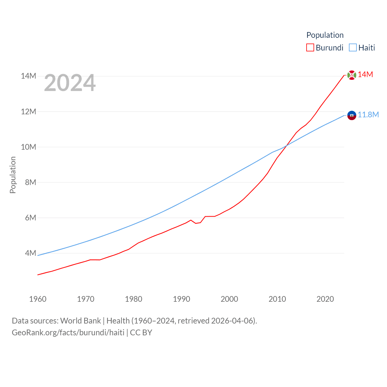 Burundi has a population of 14M (ranked 78/197), compared with 11.8M in Haiti (ranked 83/197). Burundi's land area is 9,915 sq mi versus 10,641 sq mi for Haiti (ranked 144th vs. 142nd).