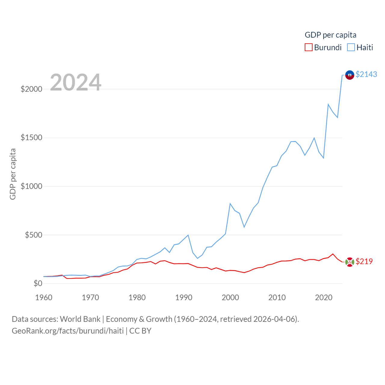 By GDP, Burundi ranks 169/197 ($3.08B) and Haiti ranks 117/197 ($25.2B). By GDP per capita, Burundi ranks 197/197 ($219.4), while Haiti ranks 153/197 ($2,143).