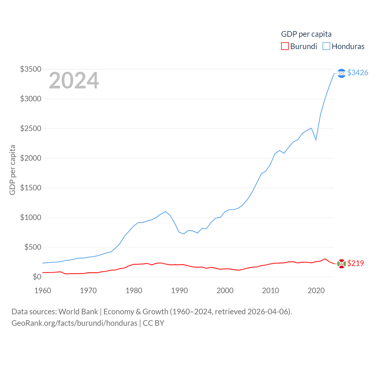 By GDP, Burundi ranks 169/197 ($3.08B) and Honduras ranks 104/197 ($37.1B). By GDP per capita, Burundi ranks 197/197 ($219.4), while Honduras ranks 136/197 ($3,426).