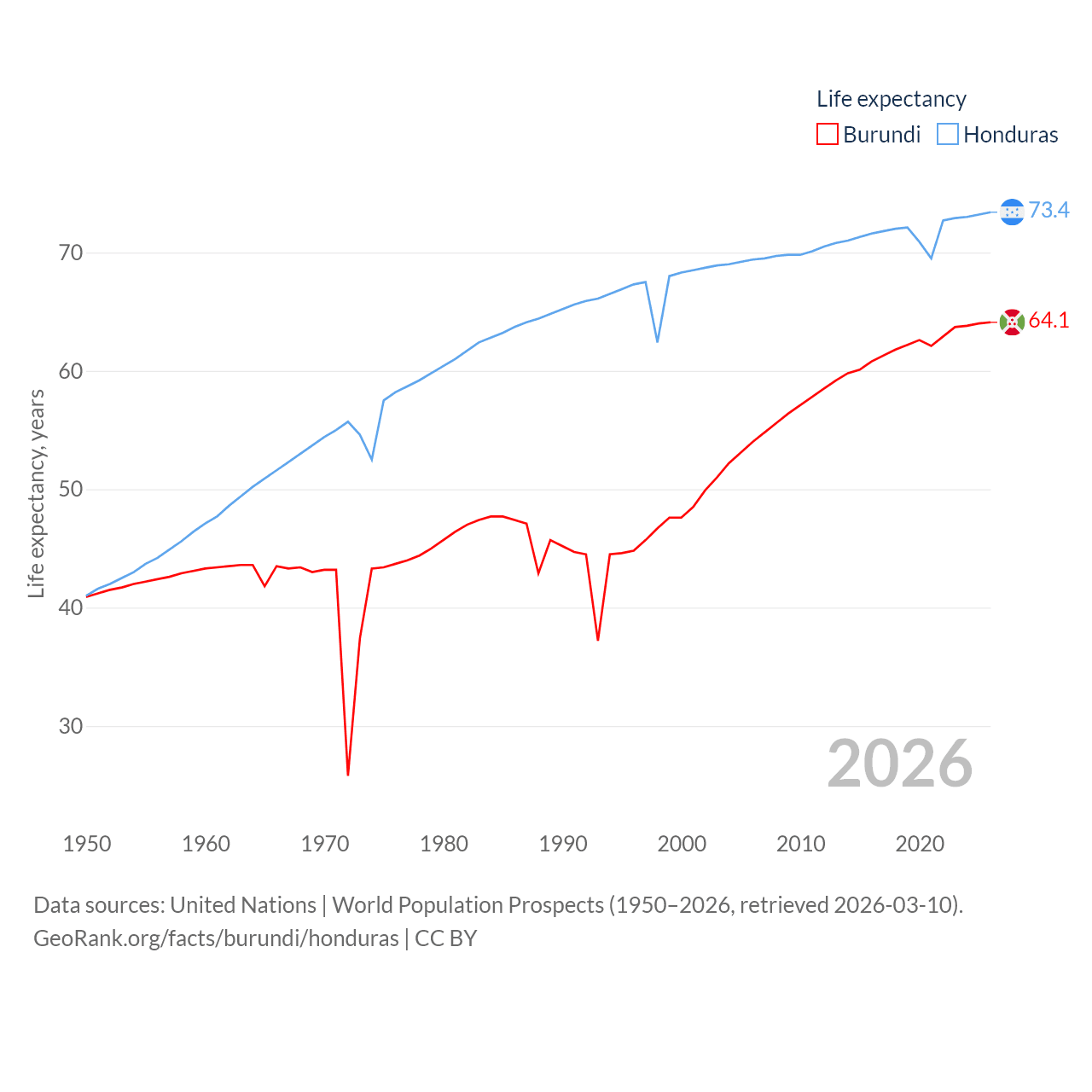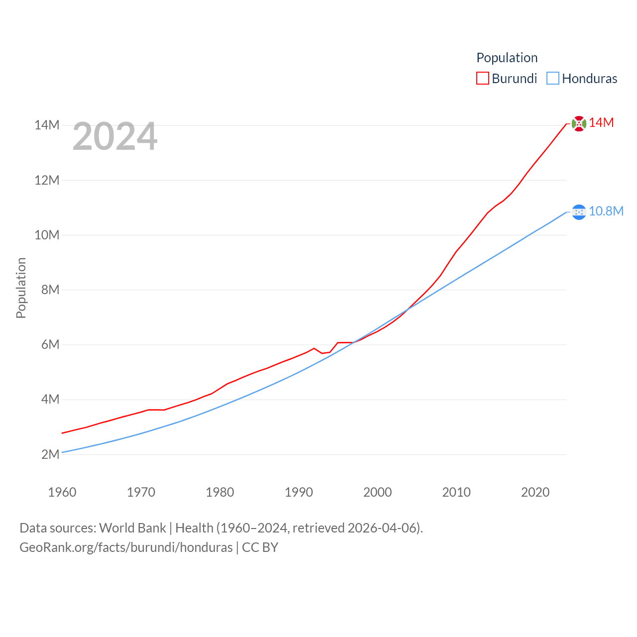 Burundi has a population of 14M (ranked 78/197), compared with 10.8M in Honduras (ranked 89/197). Burundi's land area is 9,915 sq mi versus 43,201 sq mi for Honduras (ranked 144th vs. 100th).