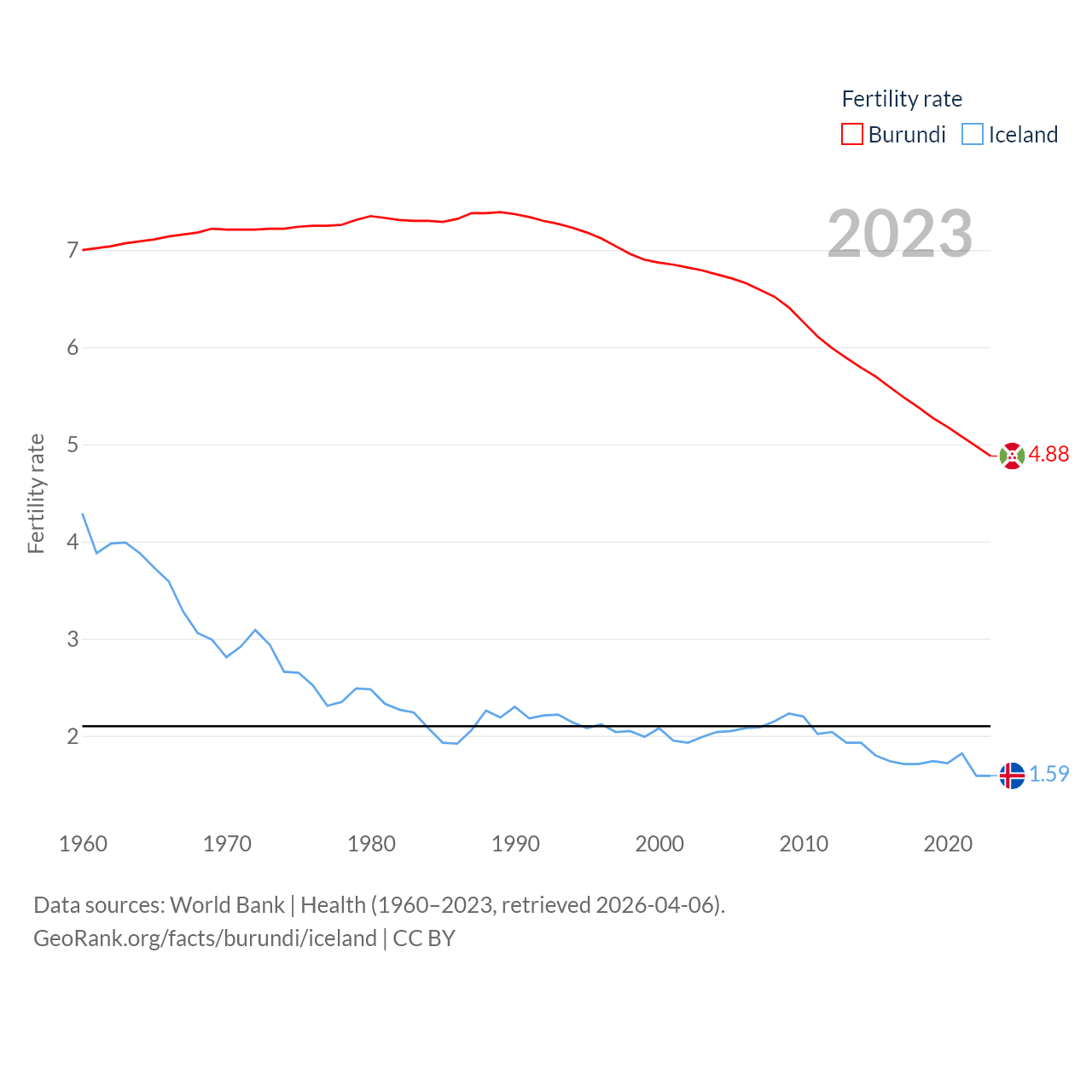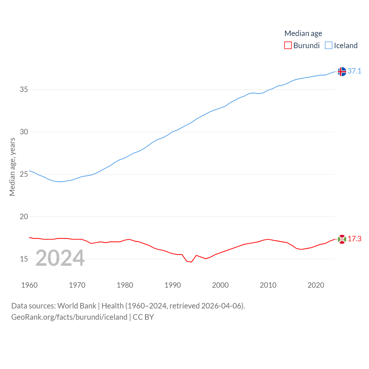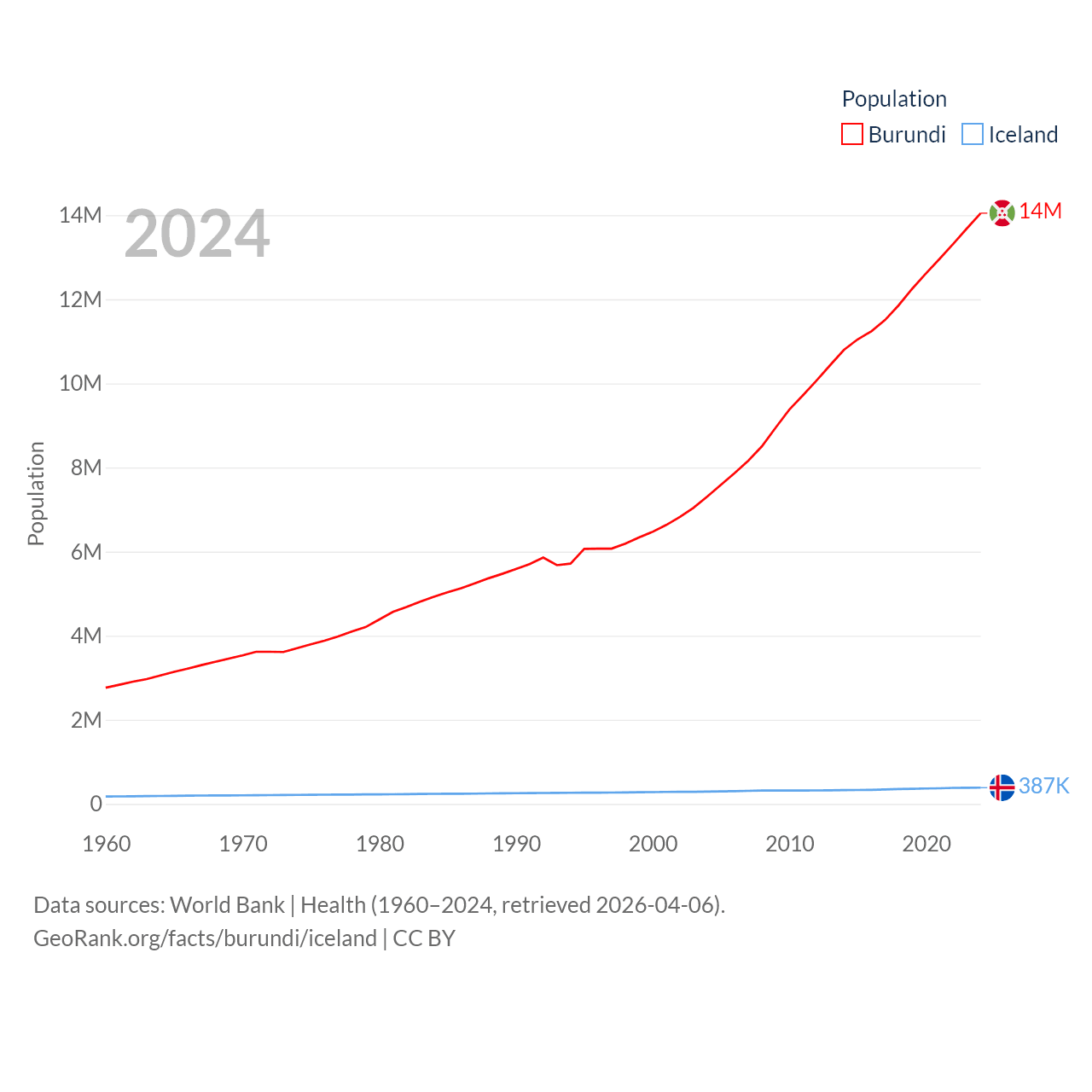 Burundi has a population of 14M (ranked 78/197), compared with 387K in Iceland (ranked 173/197). Burundi's land area is 9,915 sq mi versus 38,931 sq mi for Iceland (ranked 144th vs. 104th).
