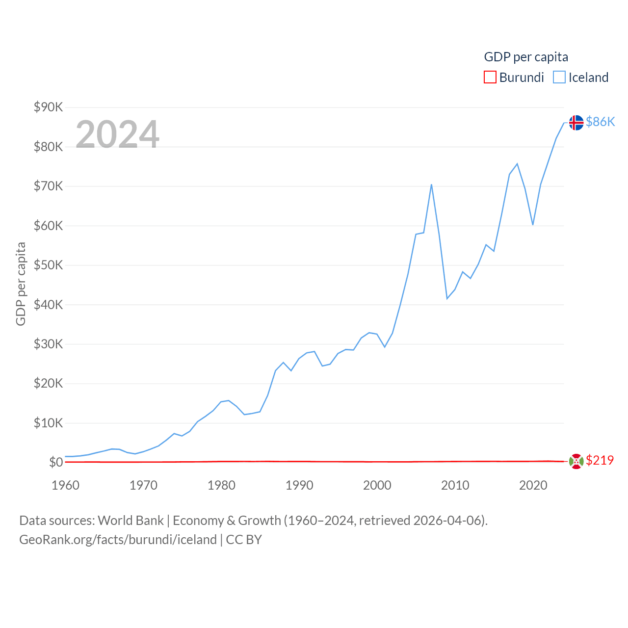 By GDP, Burundi ranks 169/197 ($3.08B) and Iceland ranks 108/197 ($33.3B). By GDP per capita, Burundi ranks 197/197 ($219.4), while Iceland ranks 9/197 ($86,041).