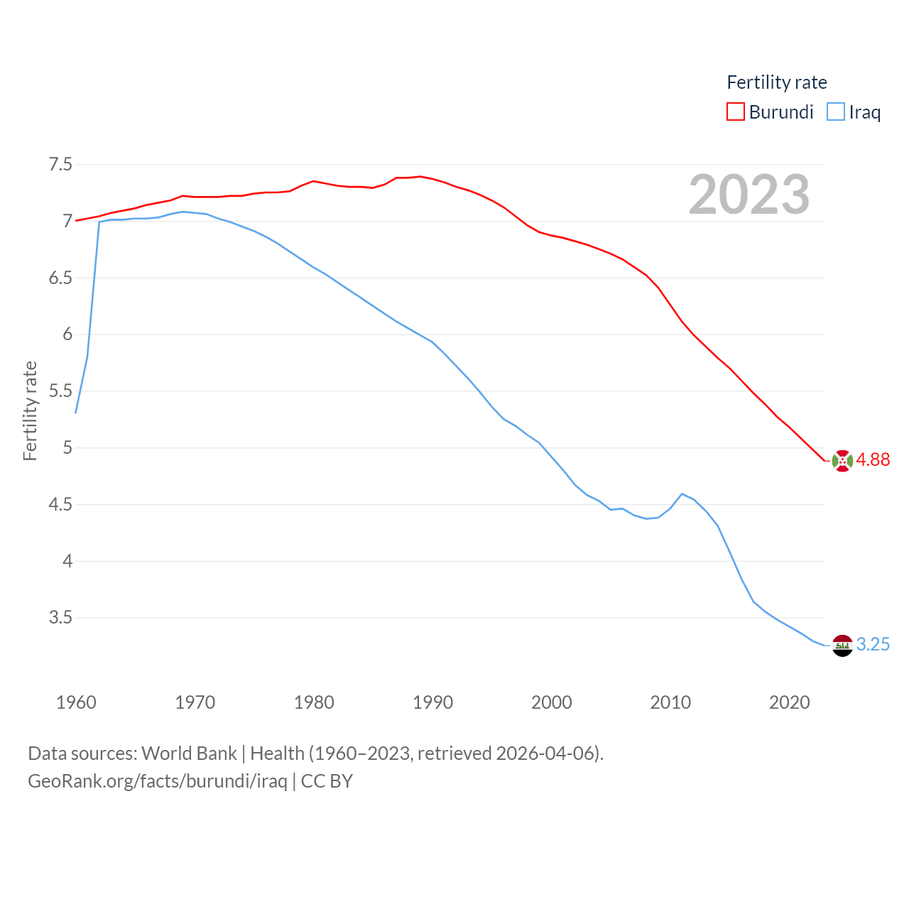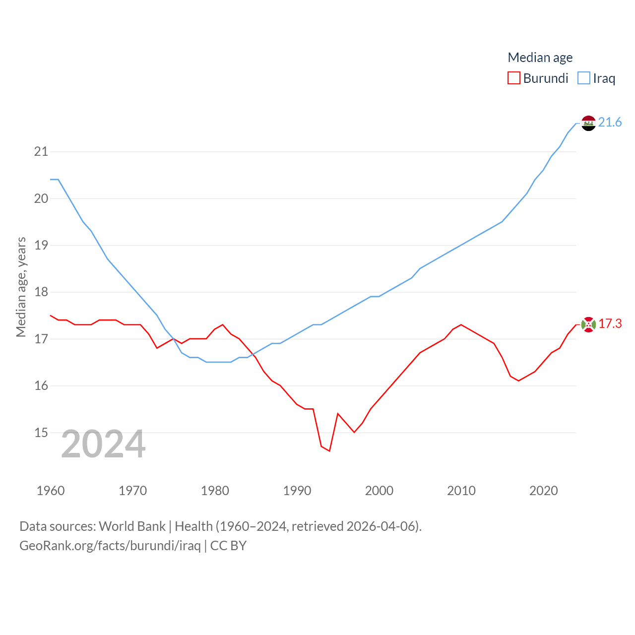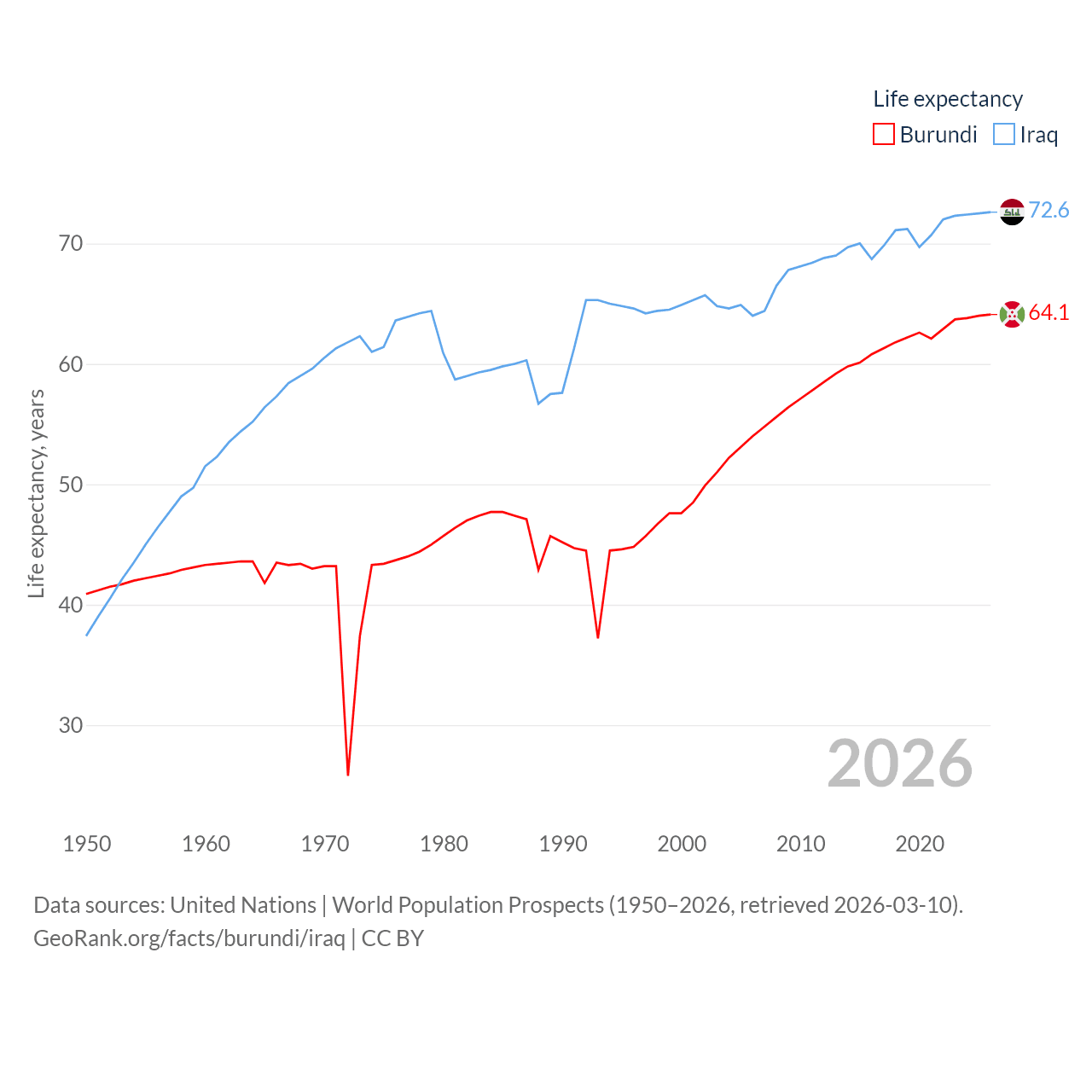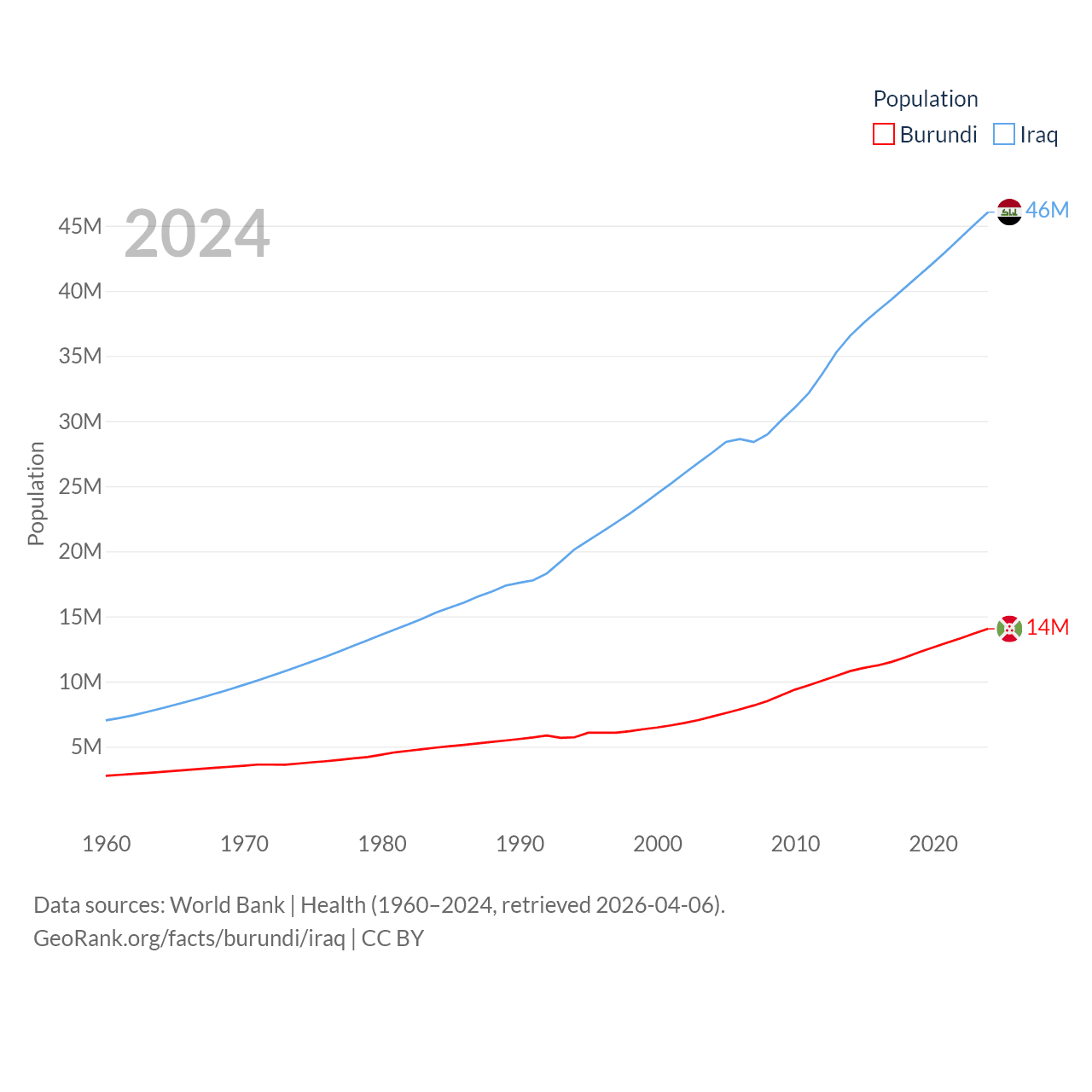 Burundi has a population of 14M (ranked 78/197), compared with 46M in Iraq (ranked 34/197). Burundi's land area is 9,915 sq mi versus 167,619 sq mi for Iraq (ranked 144th vs. 57th).