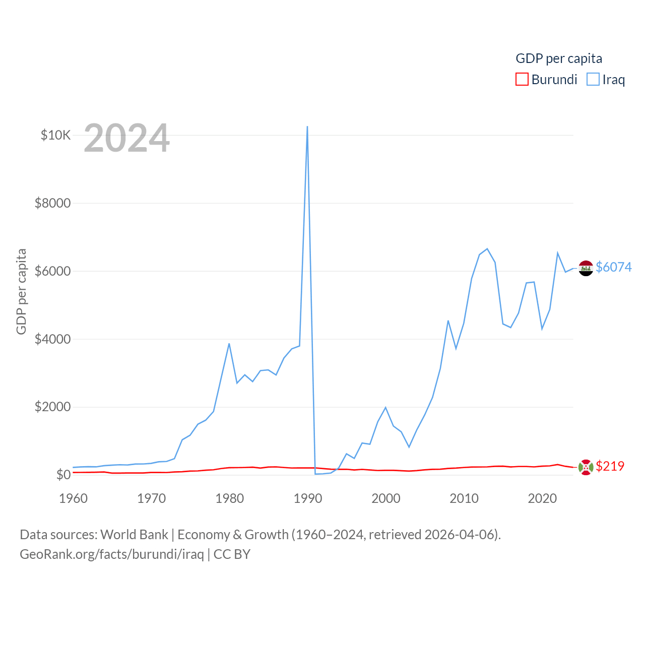 By GDP, Burundi ranks 169/197 ($3.08B) and Iraq ranks 50/197 ($280B). By GDP per capita, Burundi ranks 197/197 ($219.4), while Iraq ranks 113/197 ($6,074).