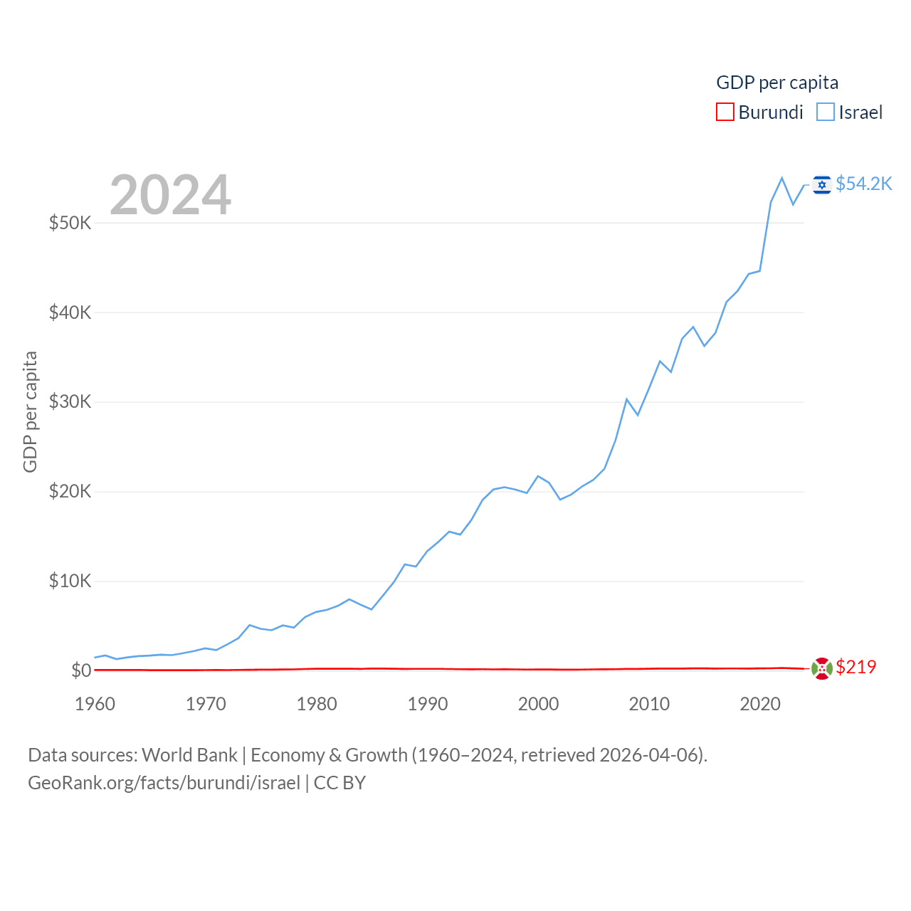 By GDP, Burundi ranks 169/197 ($3.08B) and Israel ranks 29/197 ($540B). By GDP per capita, Burundi ranks 197/197 ($219.4), while Israel ranks 21/197 ($54,177).