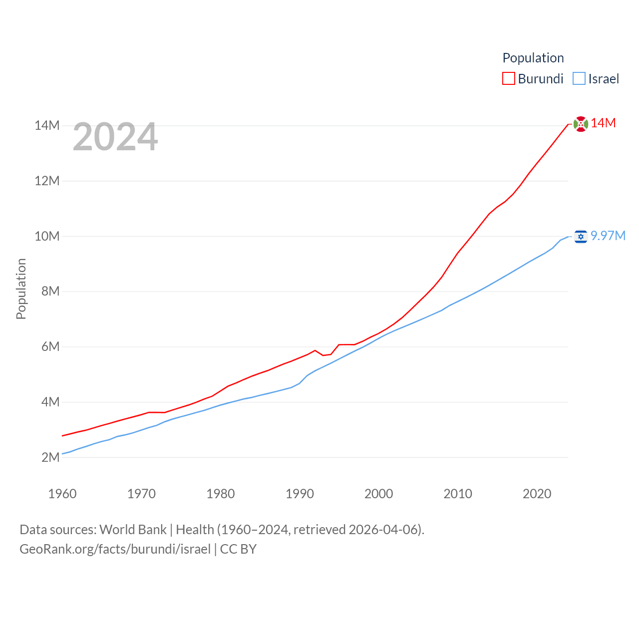 Burundi has a population of 14M (ranked 78/197), compared with 9.97M in Israel (ranked 96/197). Burundi's land area is 9,915 sq mi versus 8,355 sq mi for Israel (ranked 144th vs. 149th).