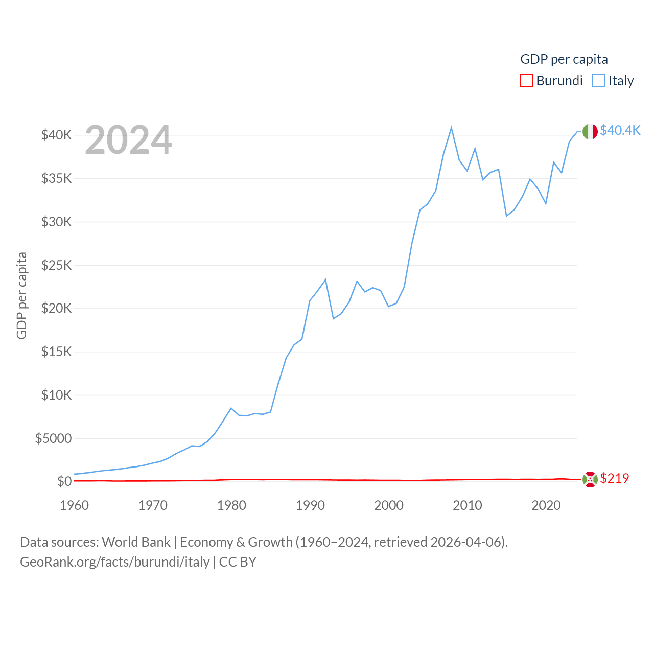 By GDP, Burundi ranks 169/197 ($3.08B) and Italy ranks 8/197 ($2.38T). By GDP per capita, Burundi ranks 197/197 ($219.4), while Italy ranks 29/197 ($40,385).