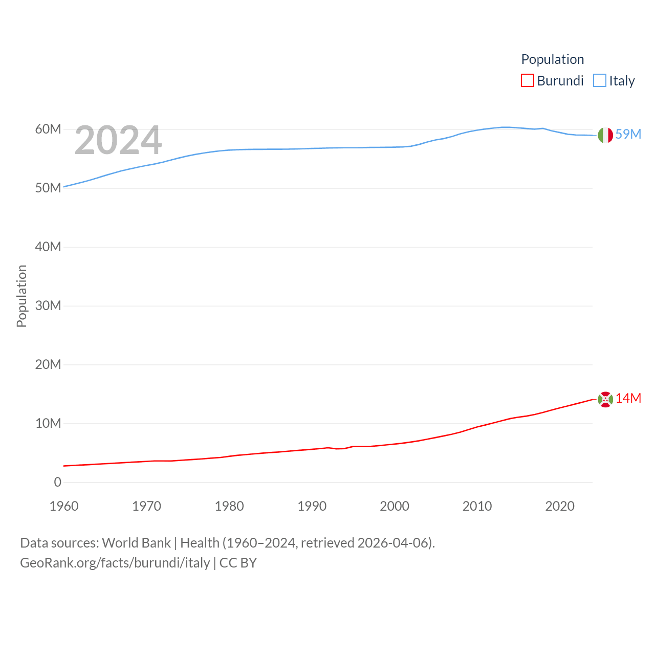 Burundi has a population of 14M (ranked 78/197), compared with 59M in Italy (ranked 25/197). Burundi's land area is 9,915 sq mi versus 114,178 sq mi for Italy (ranked 144th vs. 72nd).
