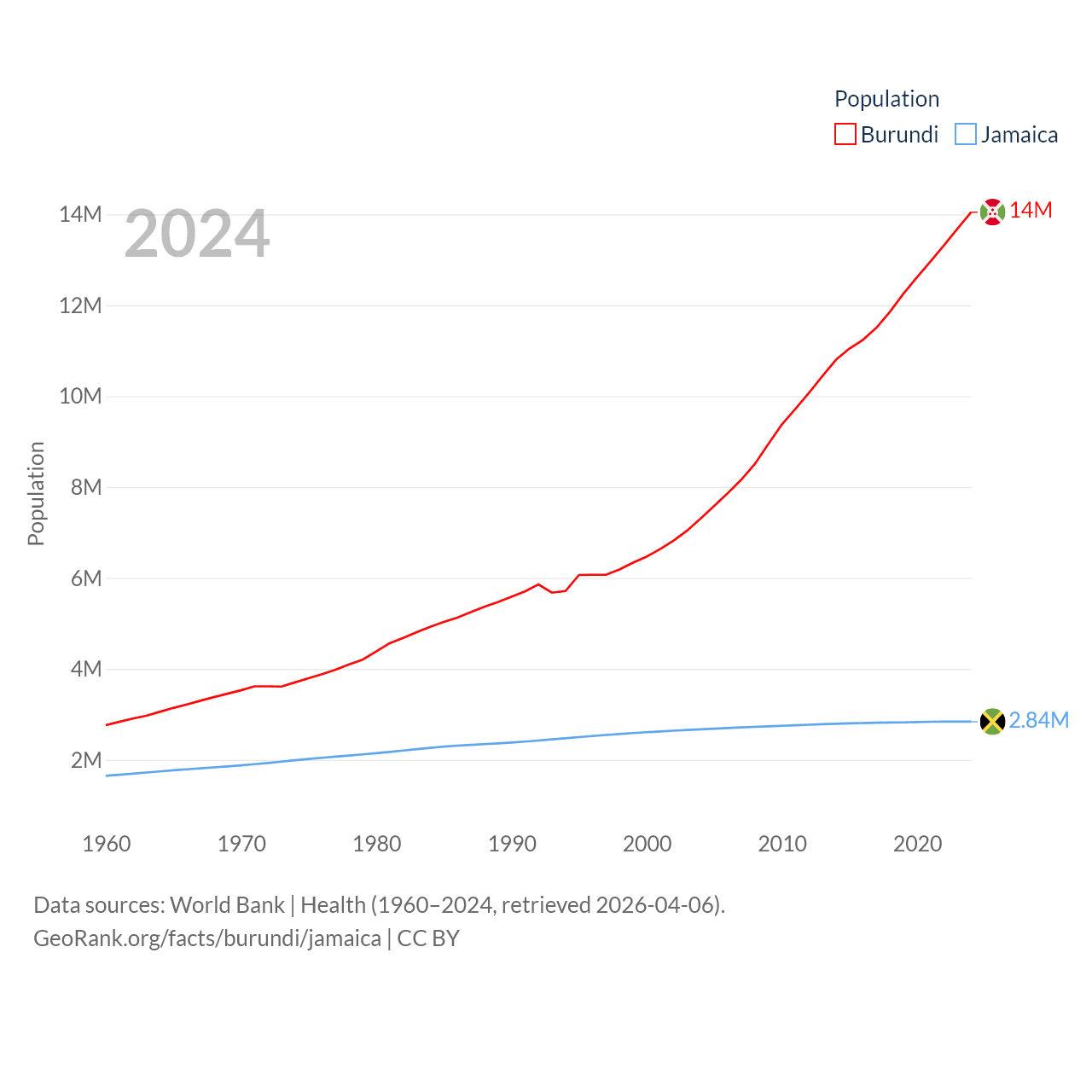 Burundi has a population of 14M (ranked 78/197), compared with 2.84M in Jamaica (ranked 139/197). Burundi's land area is 9,915 sq mi versus 4,181 sq mi for Jamaica (ranked 144th vs. 159th).
