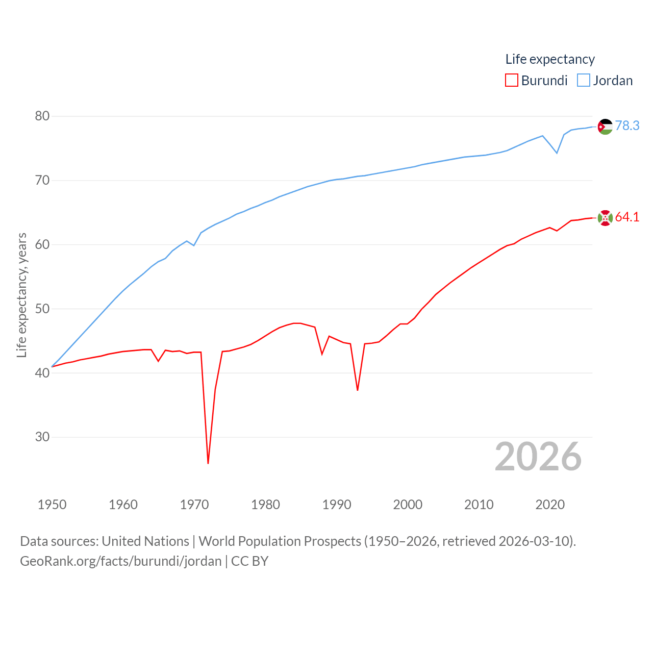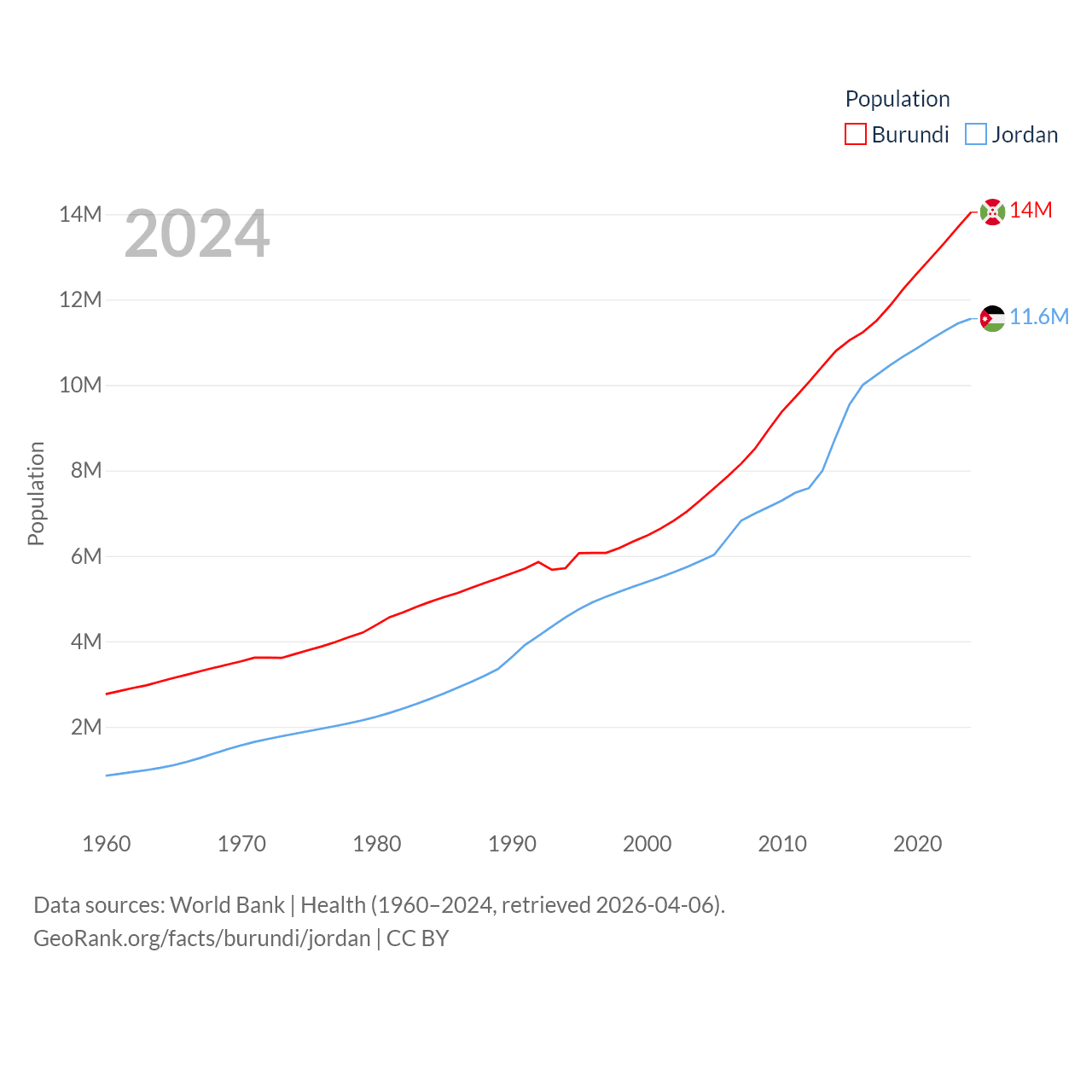 Burundi has a population of 14M (ranked 78/197), compared with 11.6M in Jordan (ranked 84/197). Burundi's land area is 9,915 sq mi versus 34,284 sq mi for Jordan (ranked 144th vs. 110th).