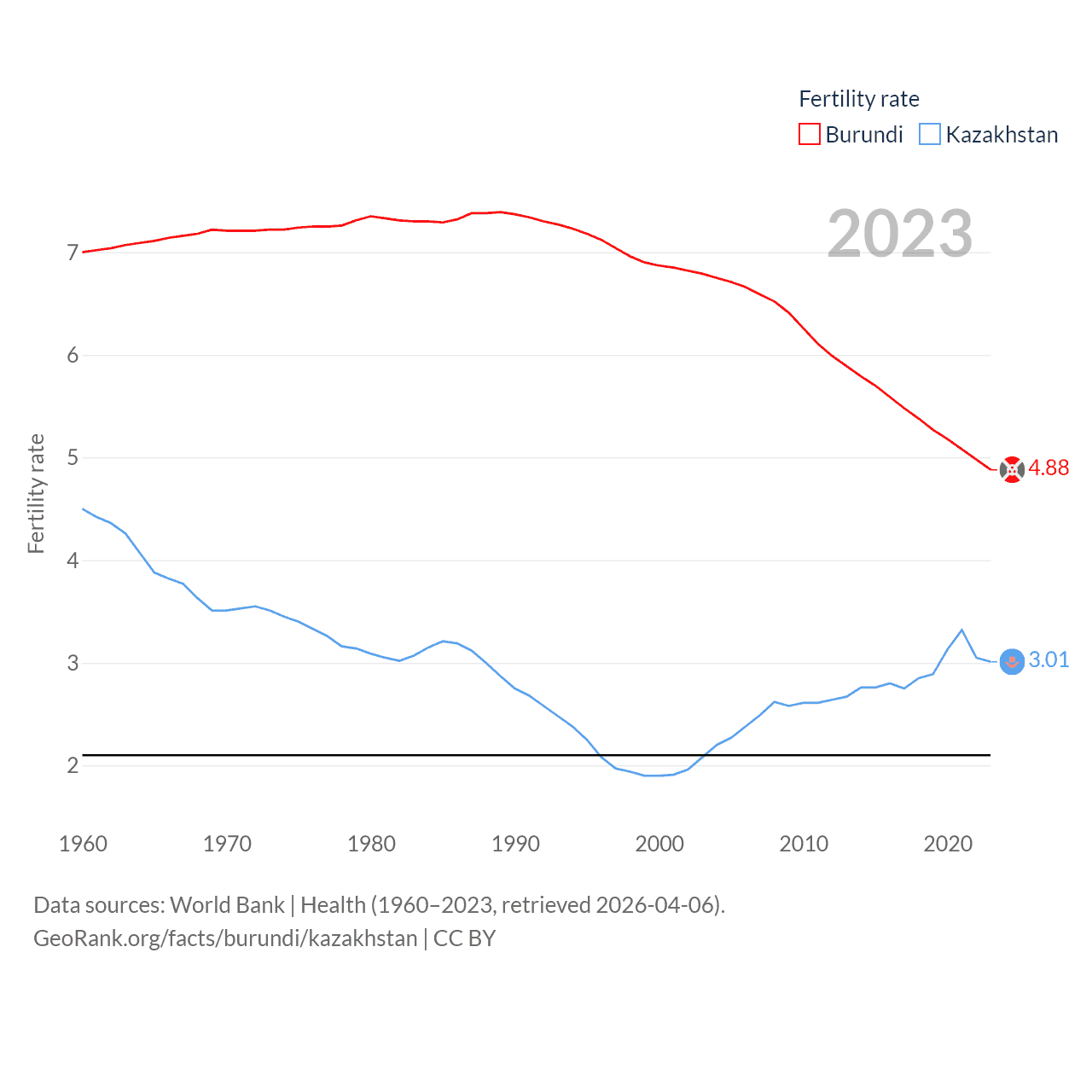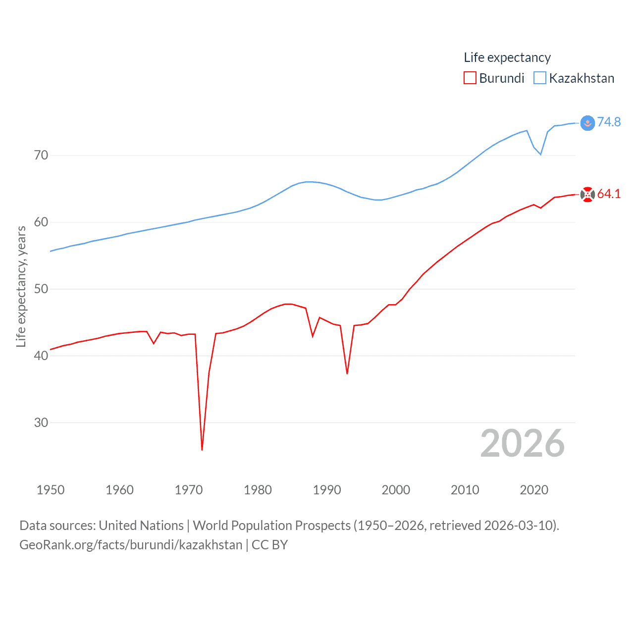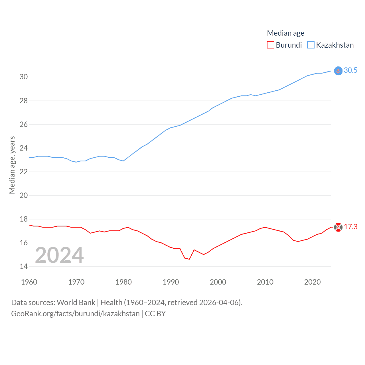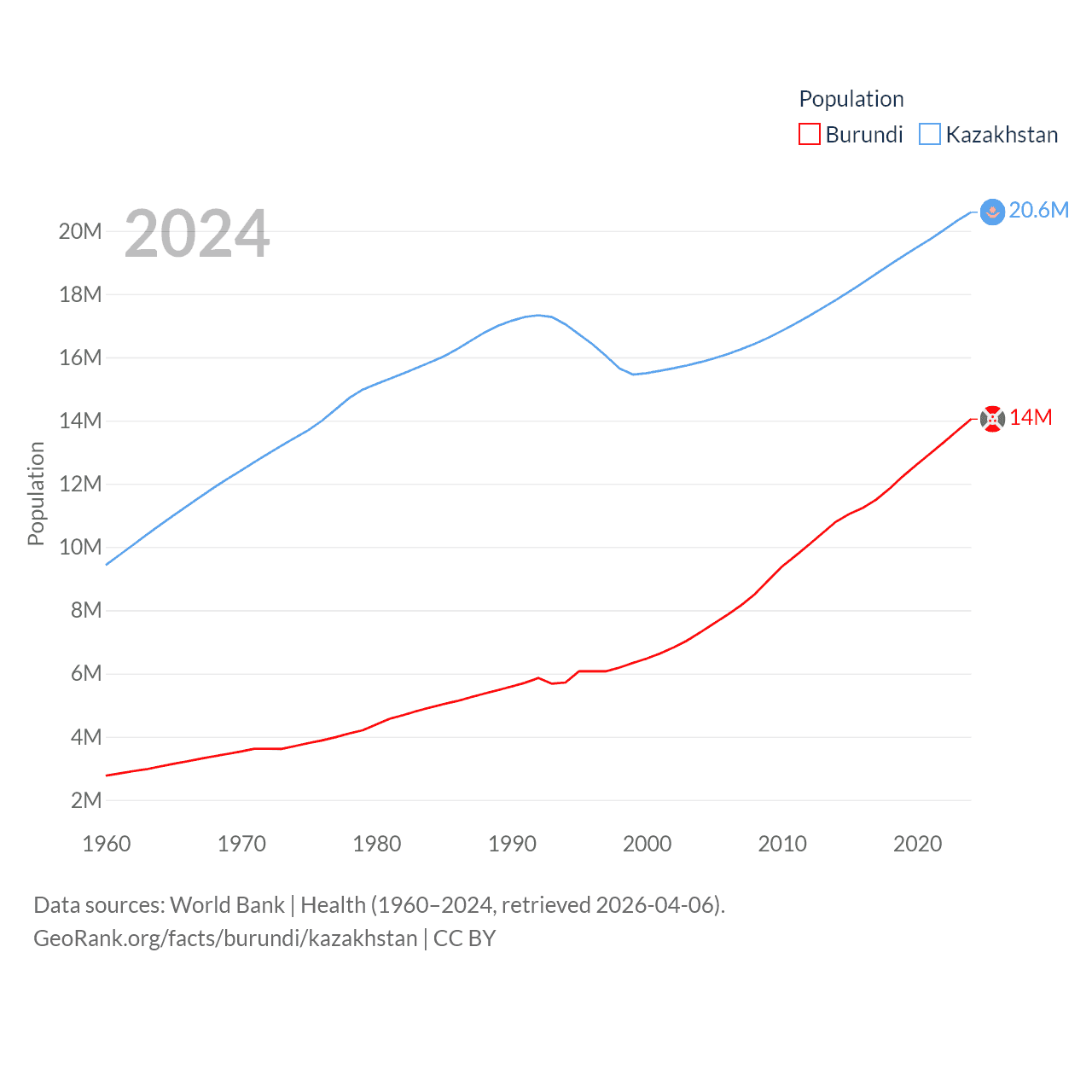 Burundi has a population of 14M (ranked 78/197), compared with 20.6M in Kazakhstan (ranked 64/197). Burundi's land area is 9,915 sq mi versus 1,042,360 sq mi for Kazakhstan (ranked 144th vs. 9th).