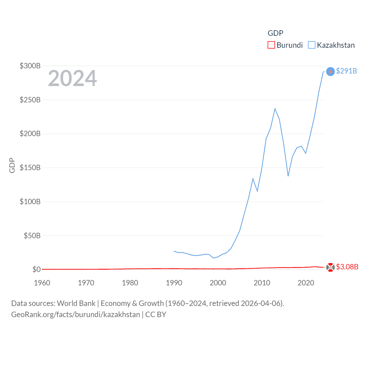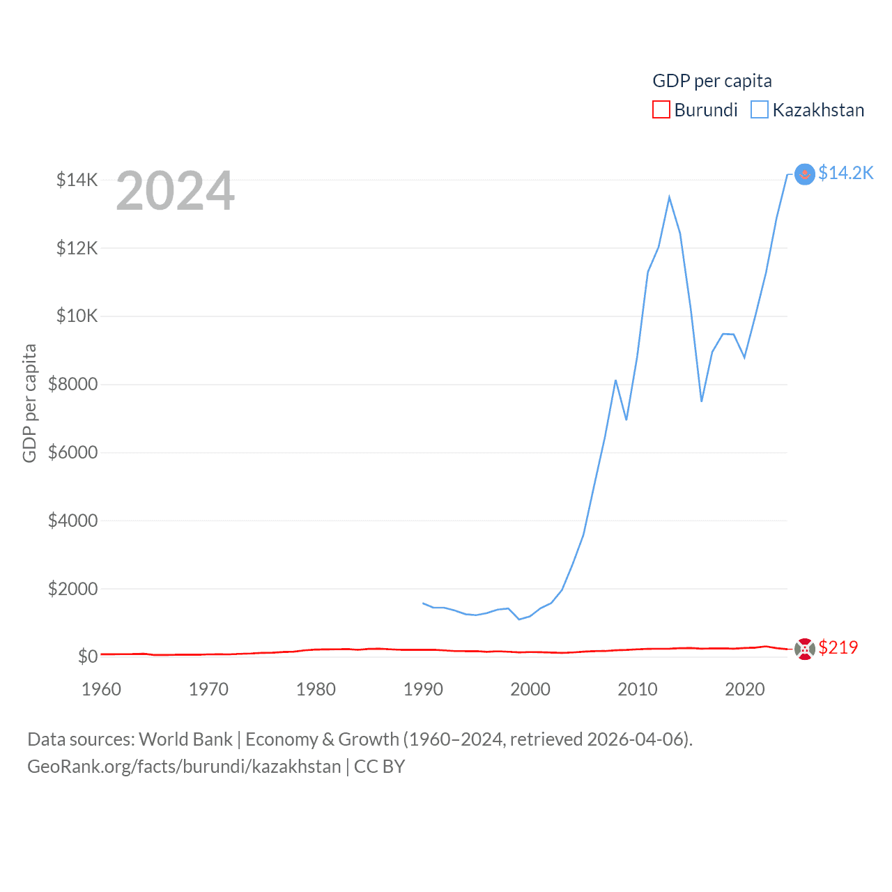 By GDP, Burundi ranks 169/197 ($3.08B) and Kazakhstan ranks 48/197 ($291B). By GDP per capita, Burundi ranks 197/197 ($219.4), while Kazakhstan ranks 71/197 ($14,155).