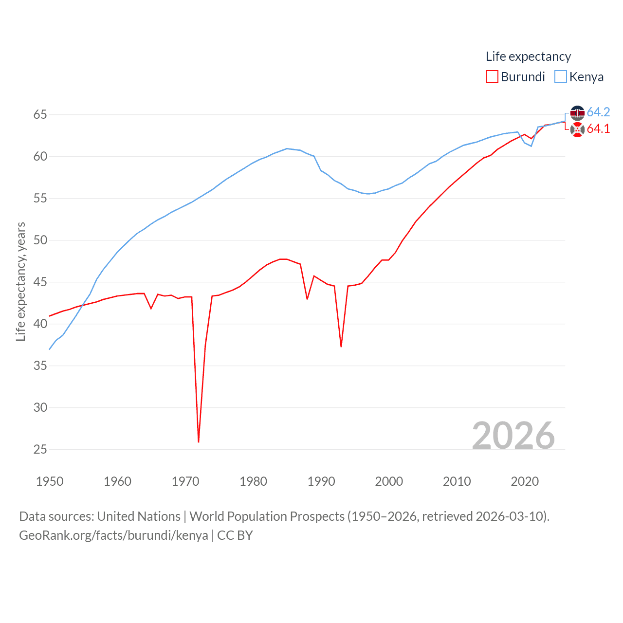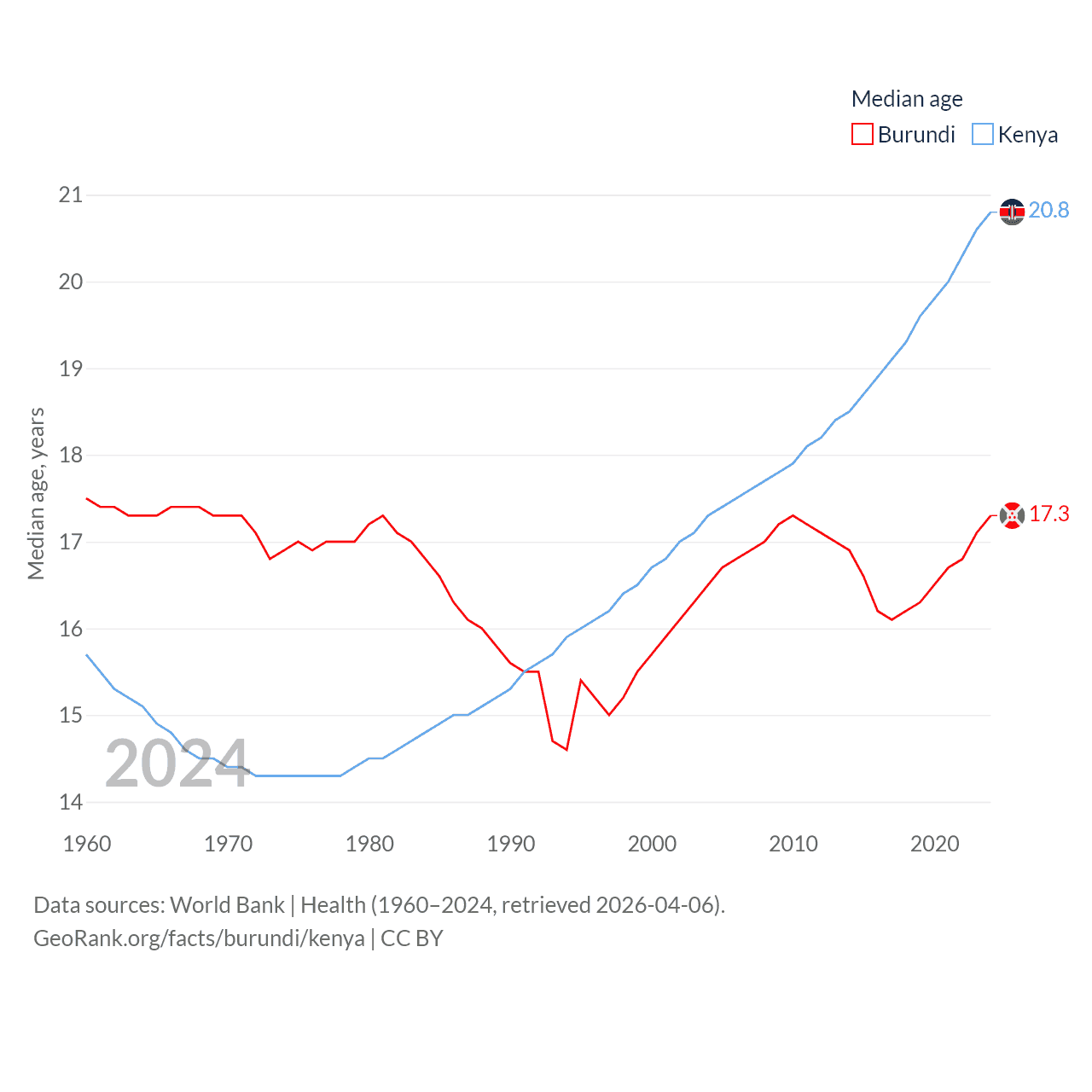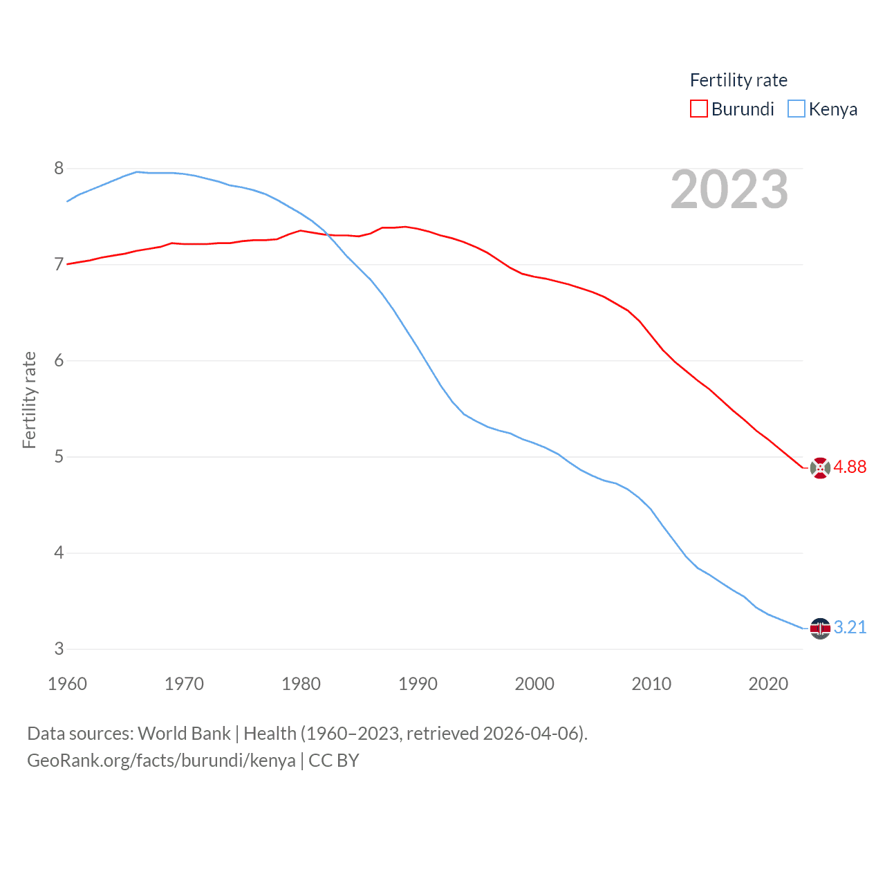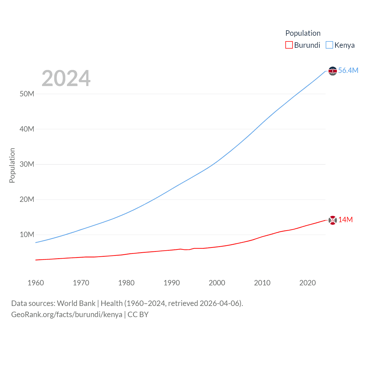 Burundi has a population of 14M (ranked 78/197), compared with 56.4M in Kenya (ranked 26/197). Burundi's land area is 9,915 sq mi versus 224,278 sq mi for Kenya (ranked 144th vs. 45th).