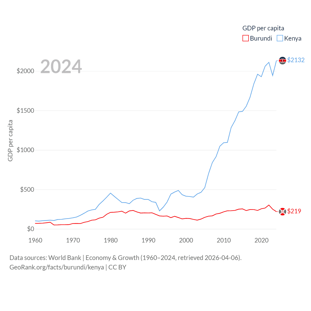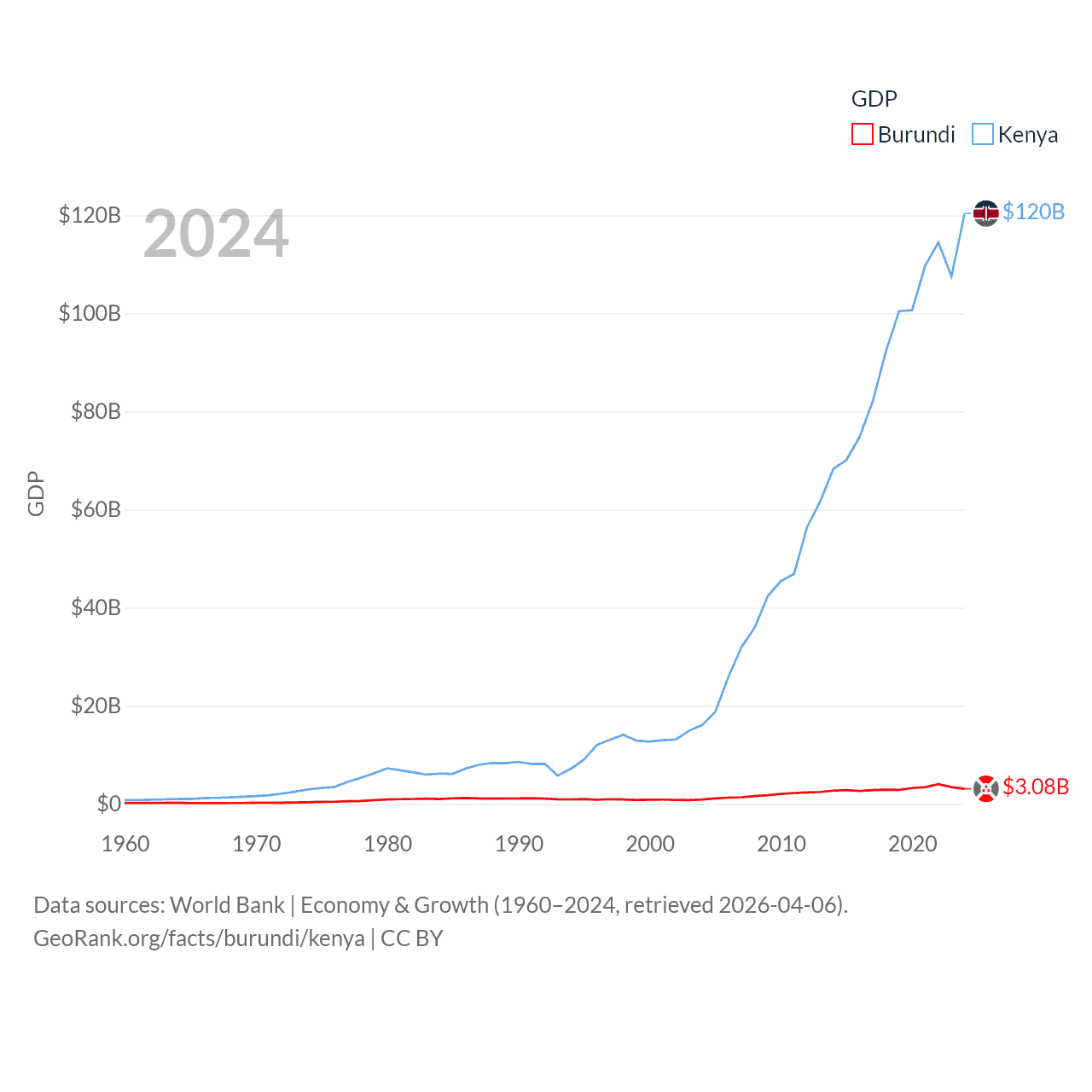 By GDP, Burundi ranks 169/197 ($3.08B) and Kenya ranks 64/197 ($120B). By GDP per capita, Burundi ranks 197/197 ($219.4), while Kenya ranks 154/197 ($2,132).