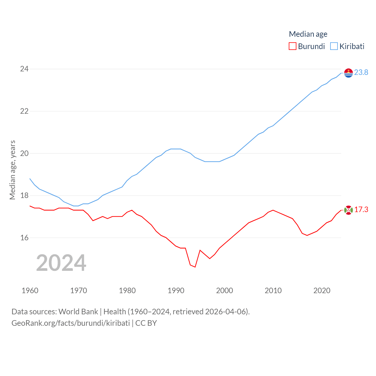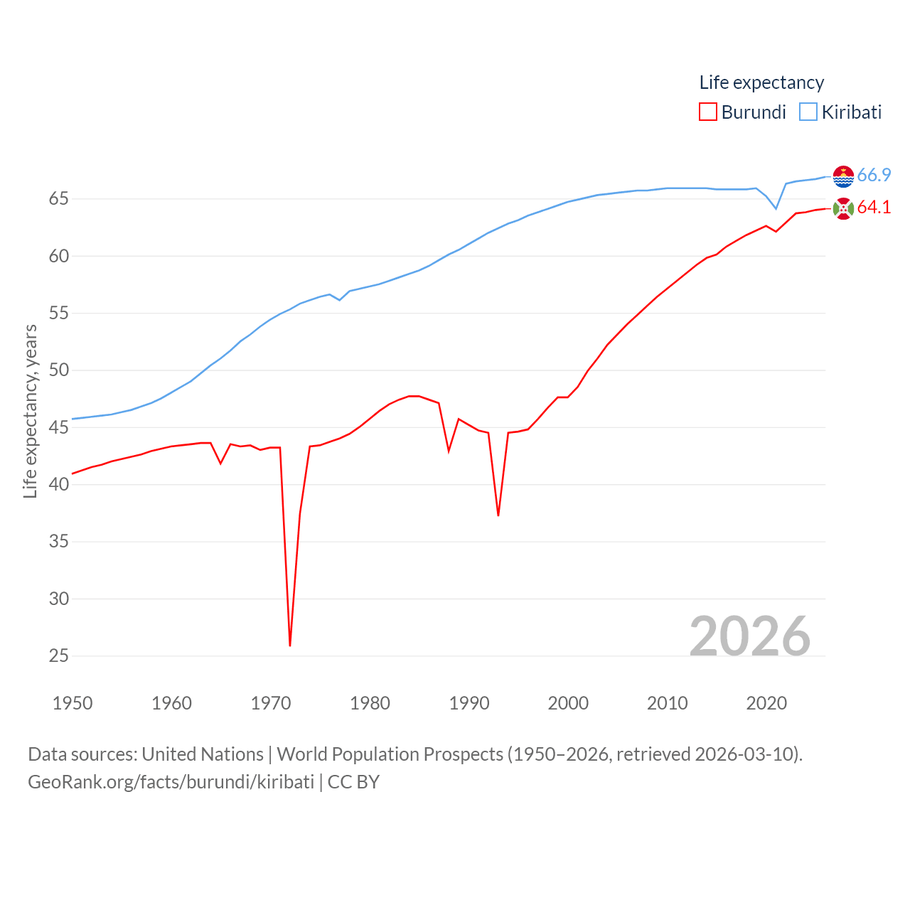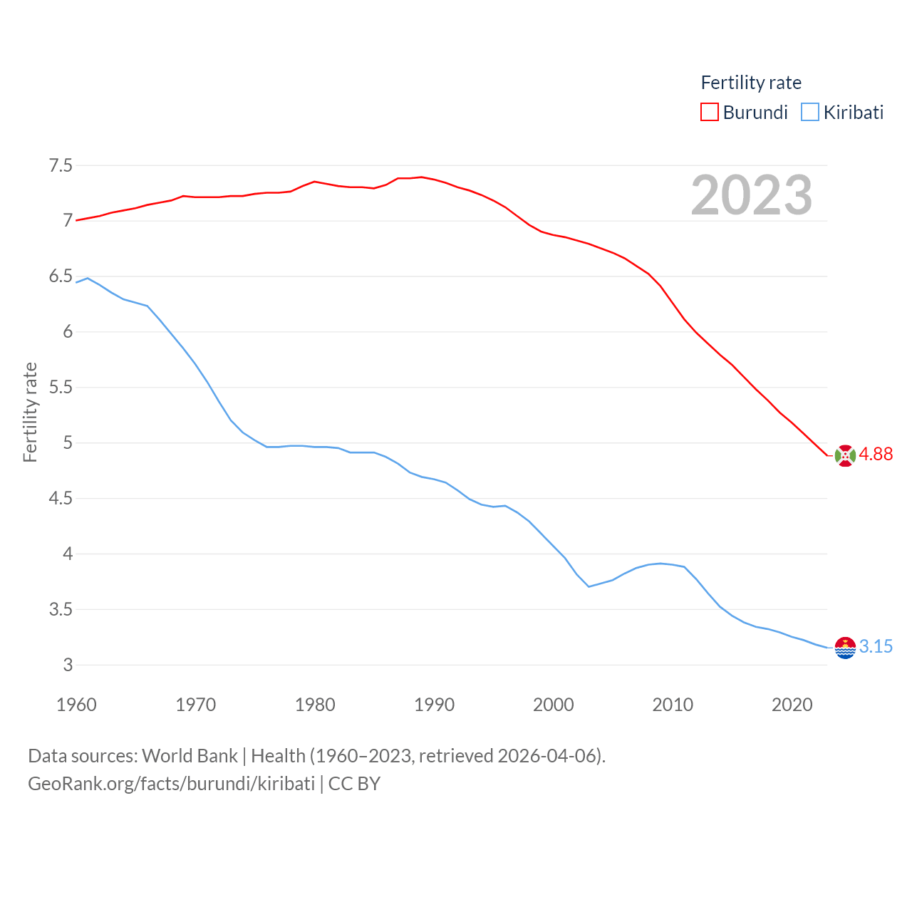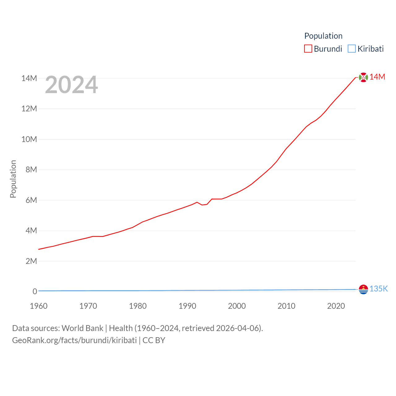 Burundi has a population of 14M (ranked 78/197), compared with 135K in Kiribati (ranked 180/197). Burundi's land area is 9,915 sq mi versus 313 sq mi for Kiribati (ranked 144th vs. 173rd).