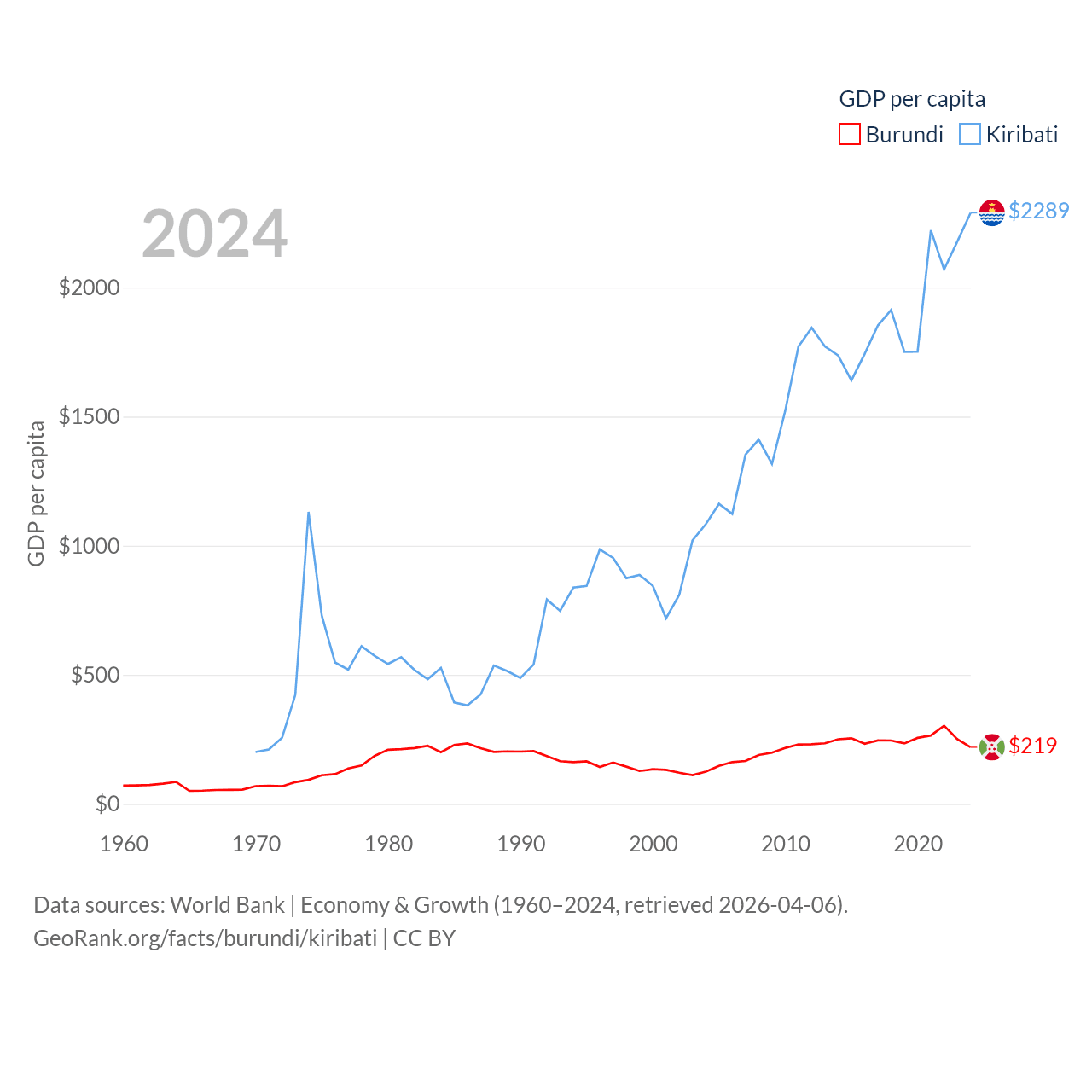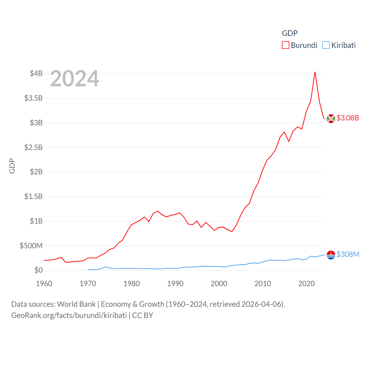 By GDP, Burundi ranks 169/197 ($3.08B) and Kiribati ranks 192/197 ($308M). By GDP per capita, Burundi ranks 197/197 ($219.4), while Kiribati ranks 152/197 ($2,289).
