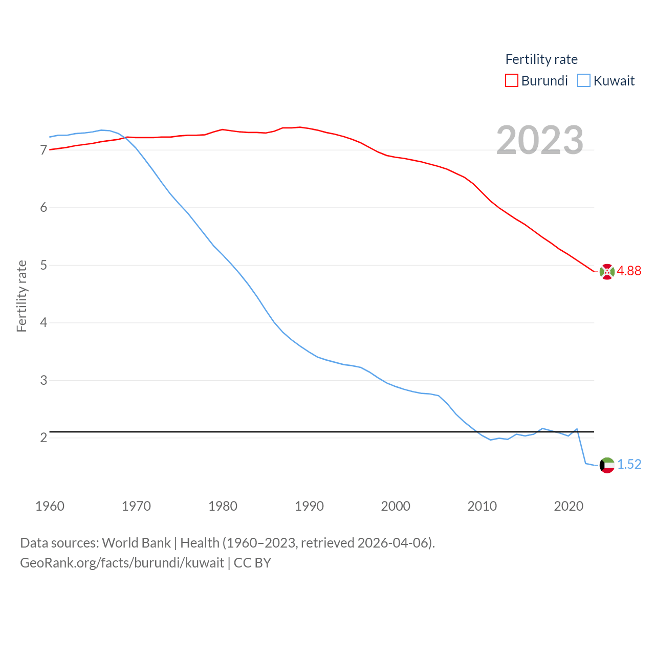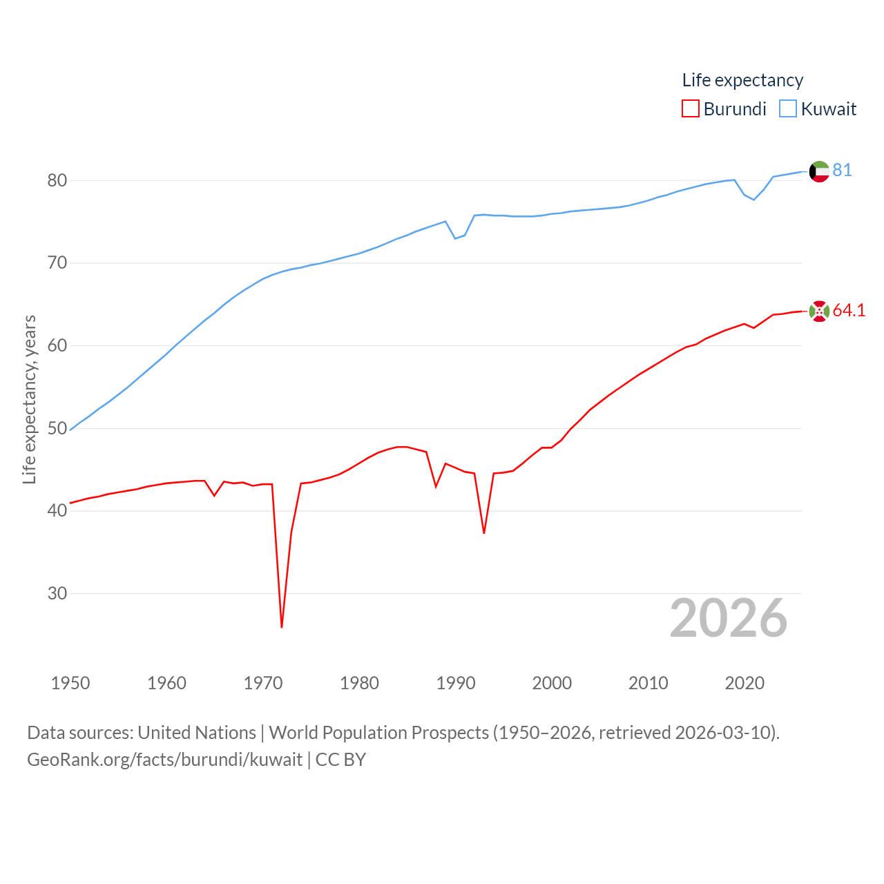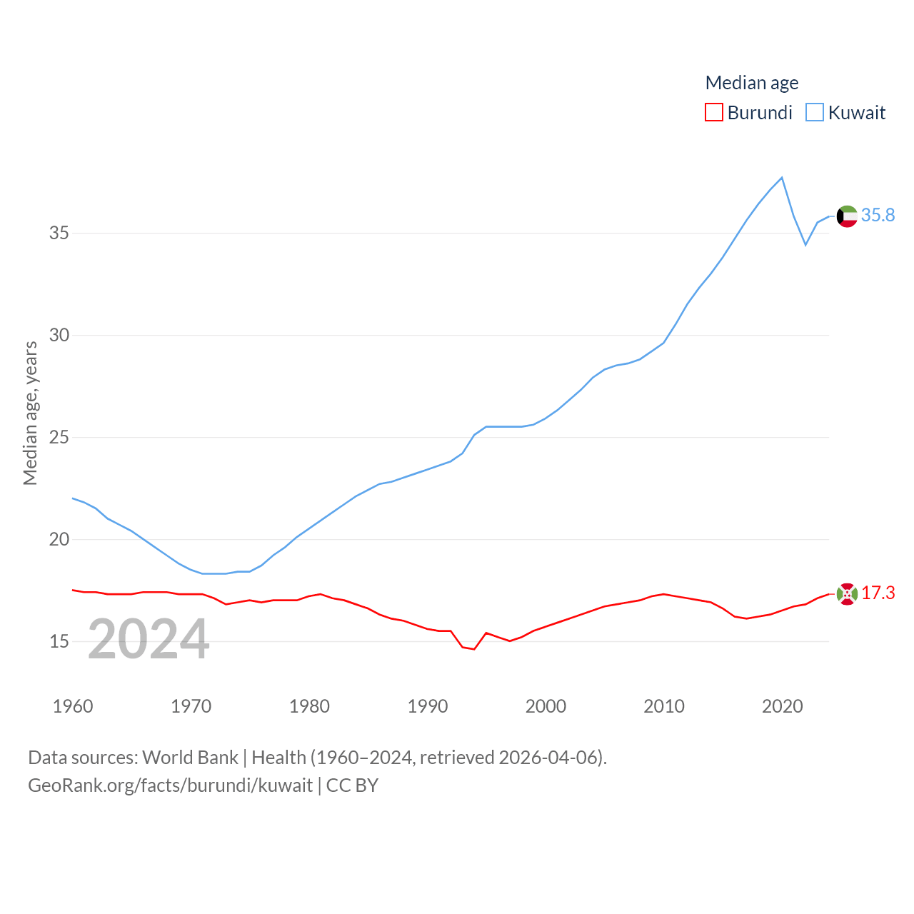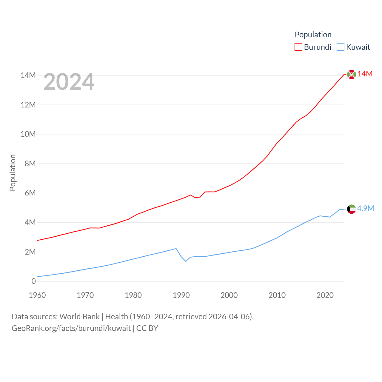 Burundi has a population of 14M (ranked 78/197), compared with 4.9M in Kuwait (ranked 127/197). Burundi's land area is 9,915 sq mi versus 6,880 sq mi for Kuwait (ranked 144th vs. 153rd).