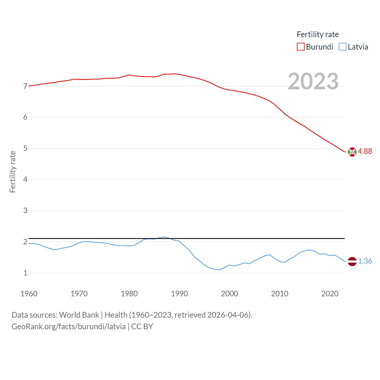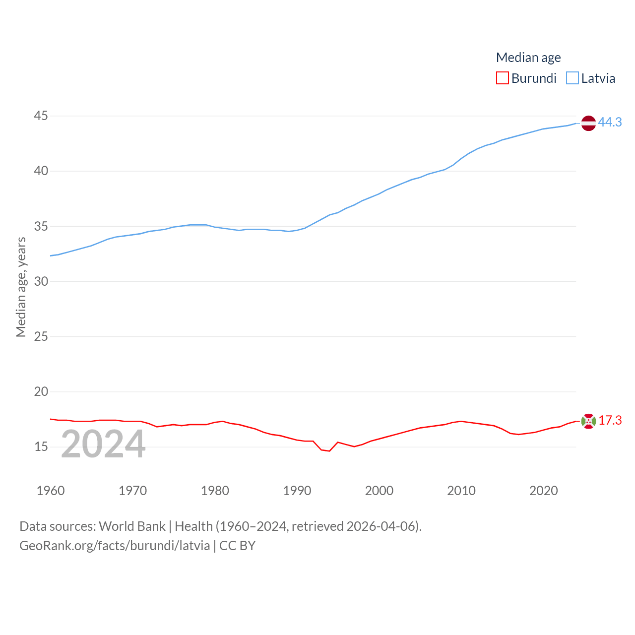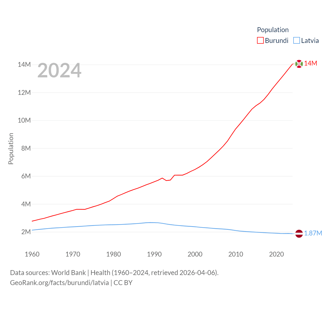 Burundi has a population of 14M (ranked 78/197), compared with 1.87M in Latvia (ranked 149/197). Burundi's land area is 9,915 sq mi versus 24,027 sq mi for Latvia (ranked 144th vs. 121st).