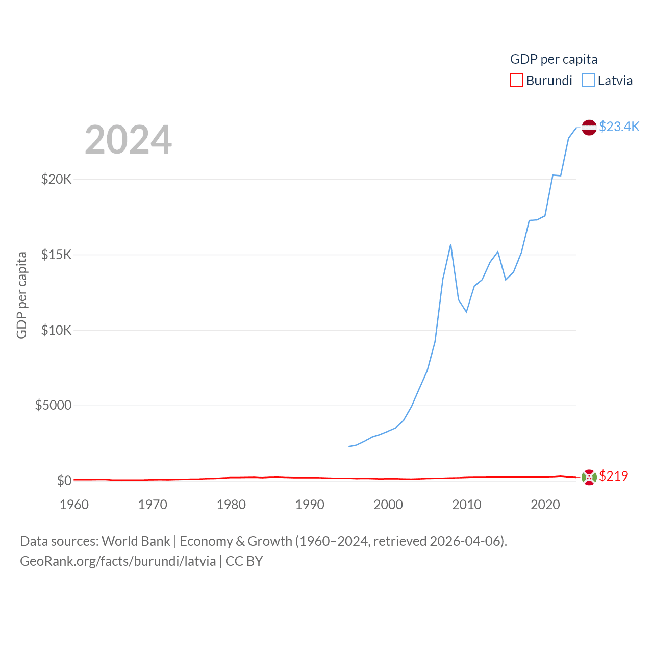 By GDP, Burundi ranks 169/197 ($3.08B) and Latvia ranks 99/197 ($43.7B). By GDP per capita, Burundi ranks 197/197 ($219.4), while Latvia ranks 54/197 ($23,409).