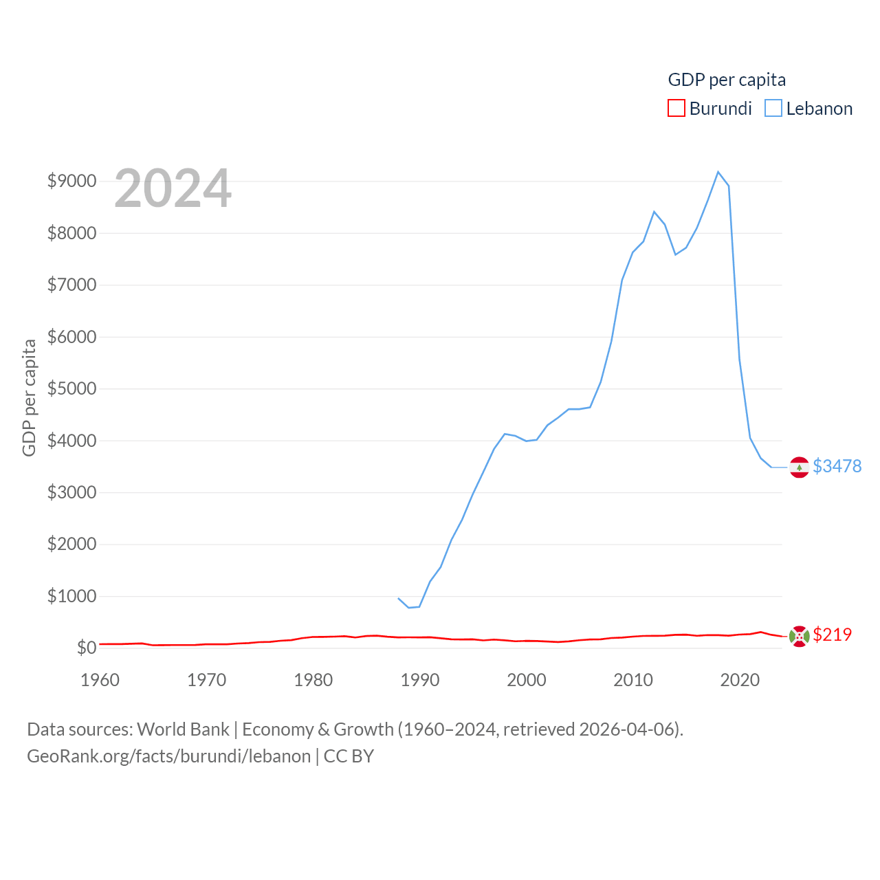 By GDP, Burundi ranks 169/197 ($3.08B) and Lebanon ranks 128/197 ($20.1B). By GDP per capita, Burundi ranks 197/197 ($219.4), while Lebanon ranks 135/197 ($3,478).