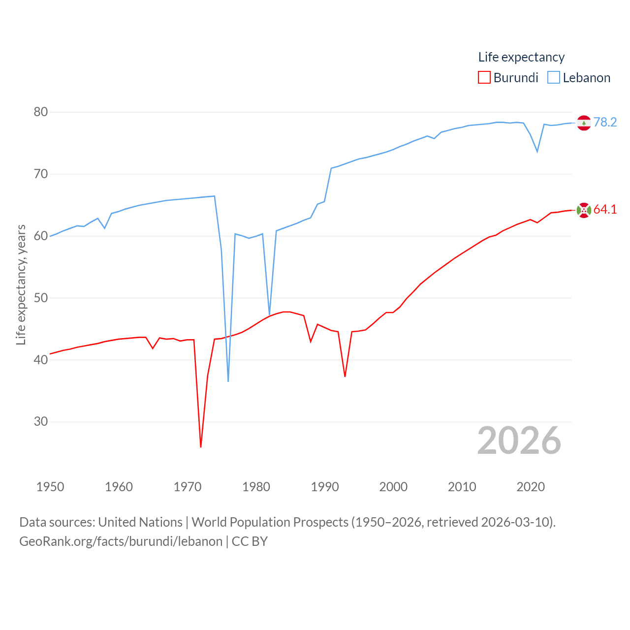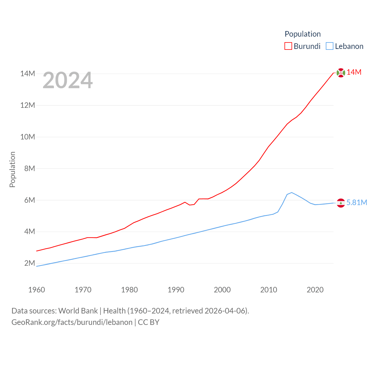 Burundi has a population of 14M (ranked 78/197), compared with 5.81M in Lebanon (ranked 115/197). Burundi's land area is 9,915 sq mi versus 3,950 sq mi for Lebanon (ranked 144th vs. 160th).