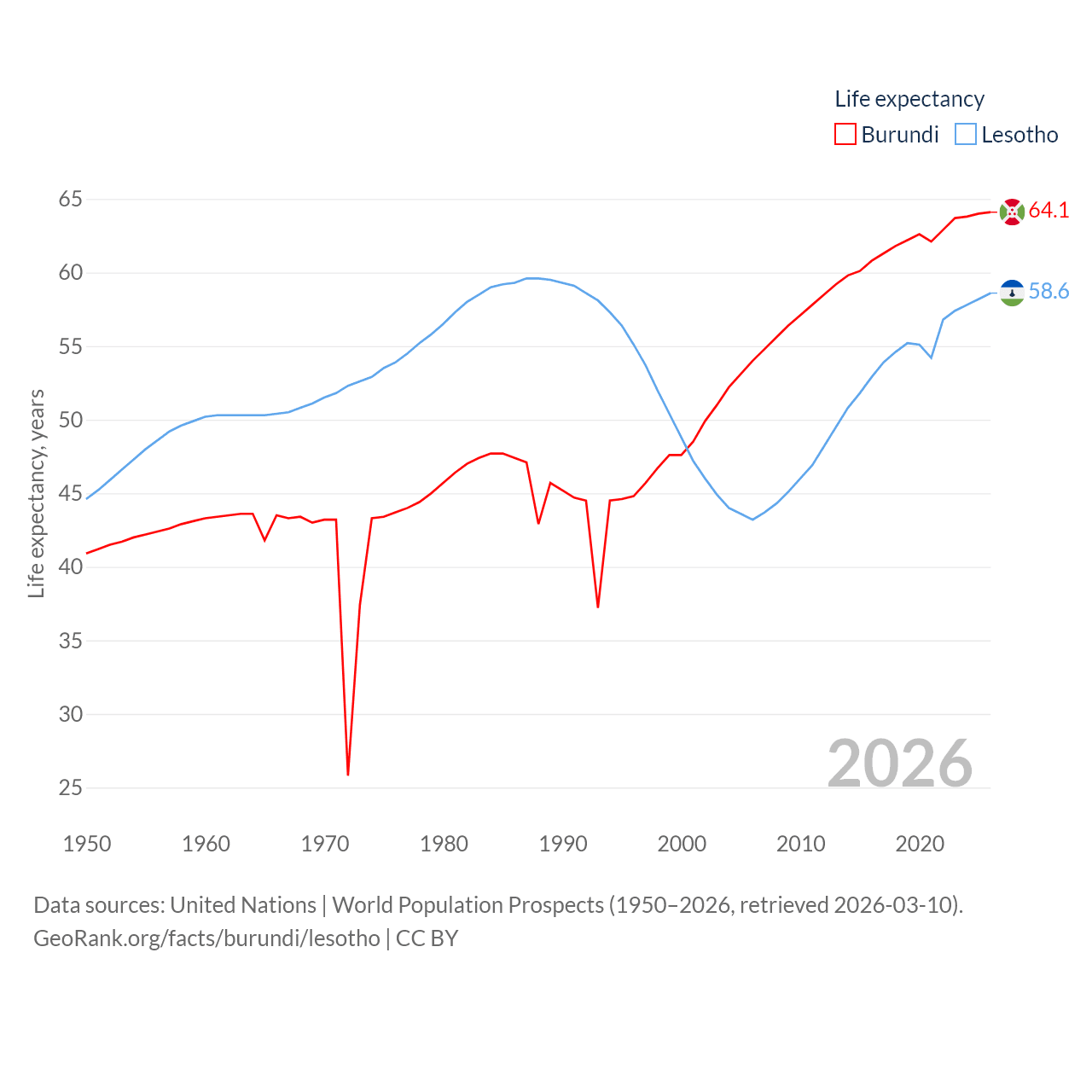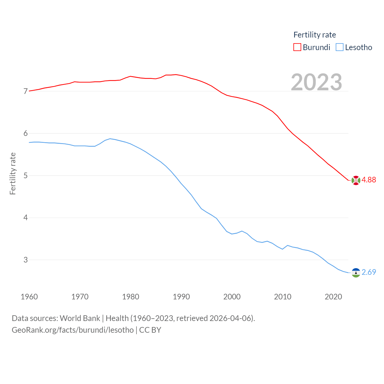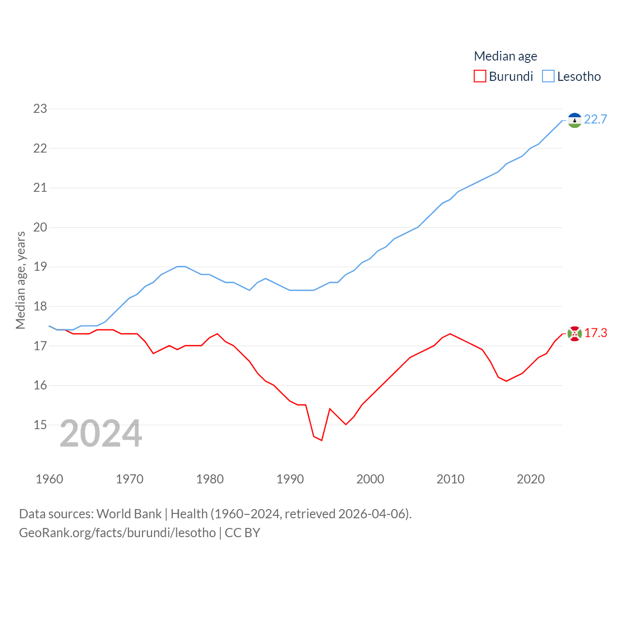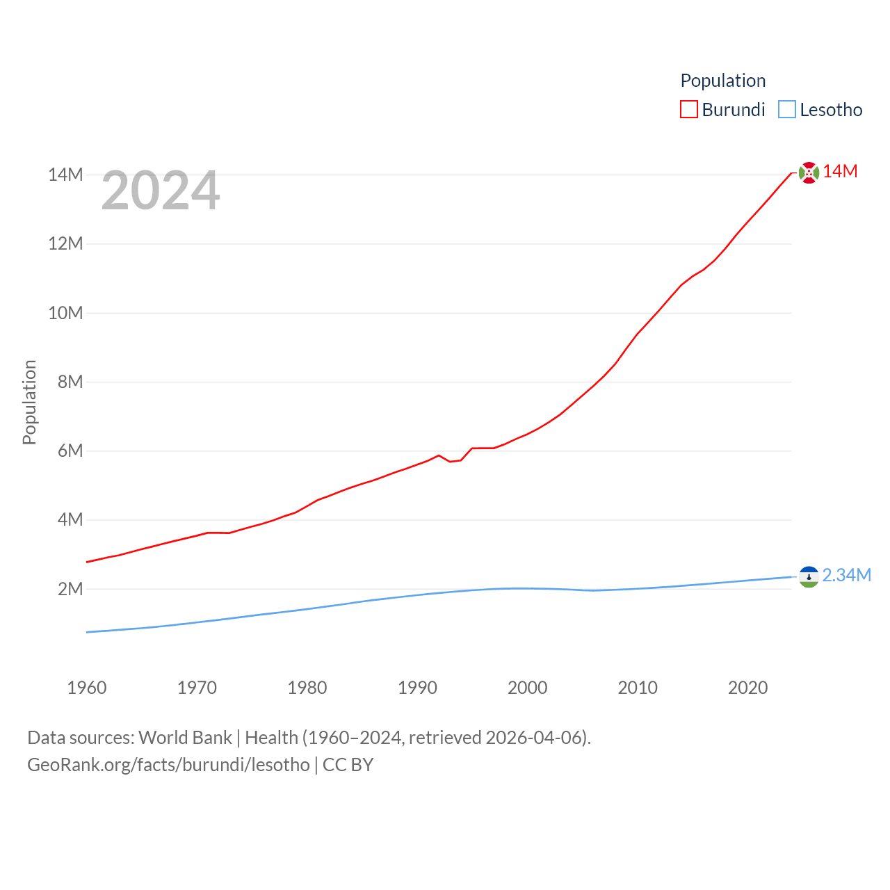 Burundi has a population of 14M (ranked 78/197), compared with 2.34M in Lesotho (ranked 145/197). Burundi's land area is 9,915 sq mi versus 11,722 sq mi for Lesotho (ranked 144th vs. 137th).