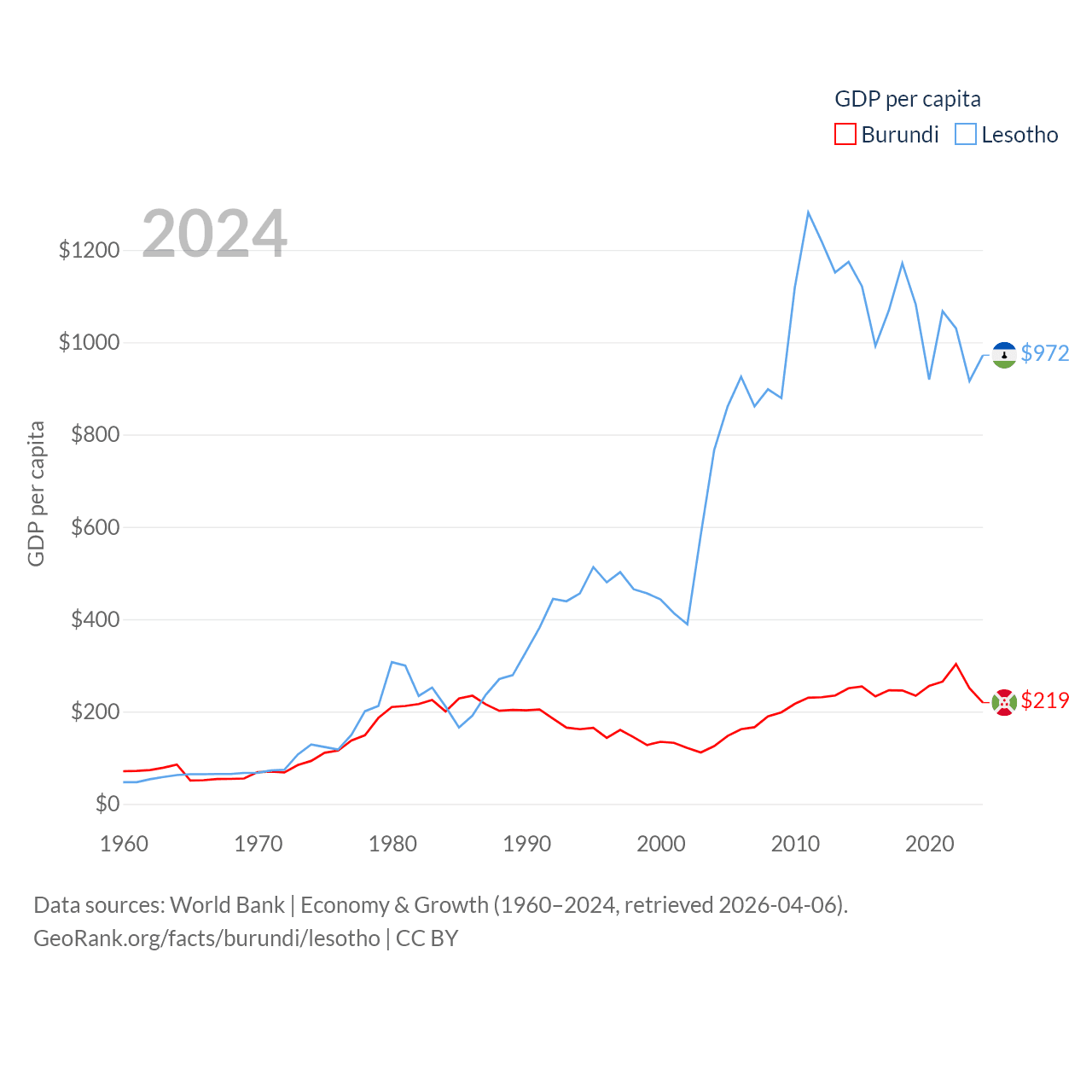 By GDP, Burundi ranks 169/197 ($3.08B) and Lesotho ranks 175/197 ($2.27B). By GDP per capita, Burundi ranks 197/197 ($219.4), while Lesotho ranks 181/197 ($972).