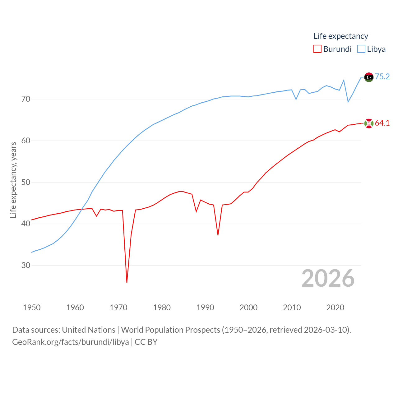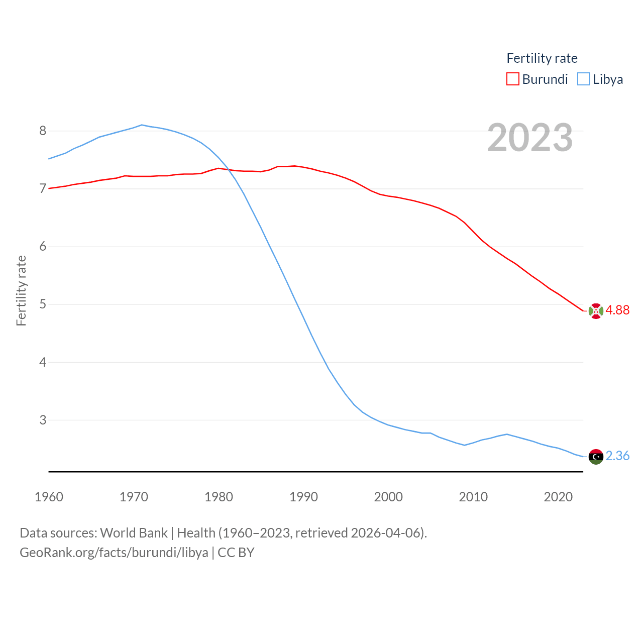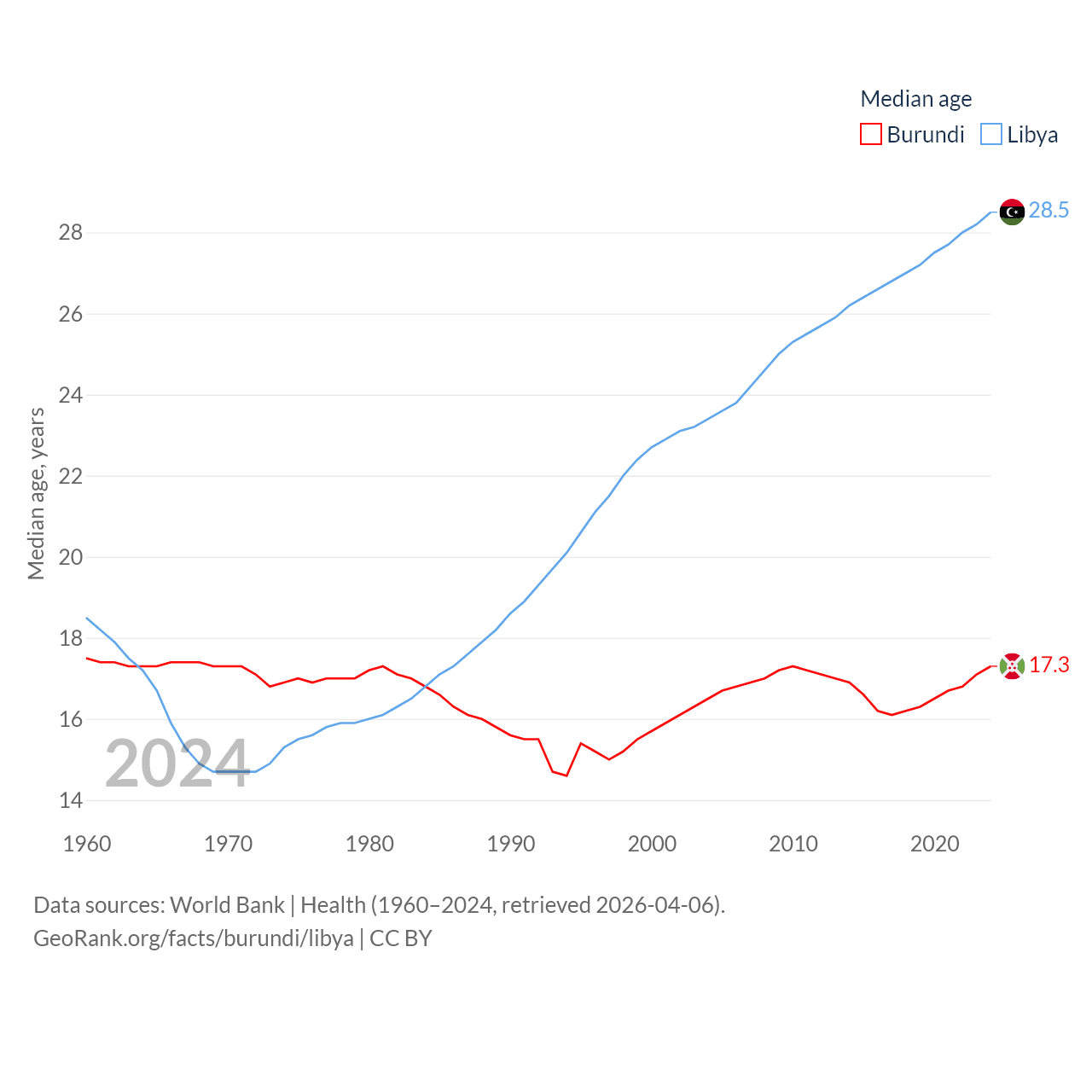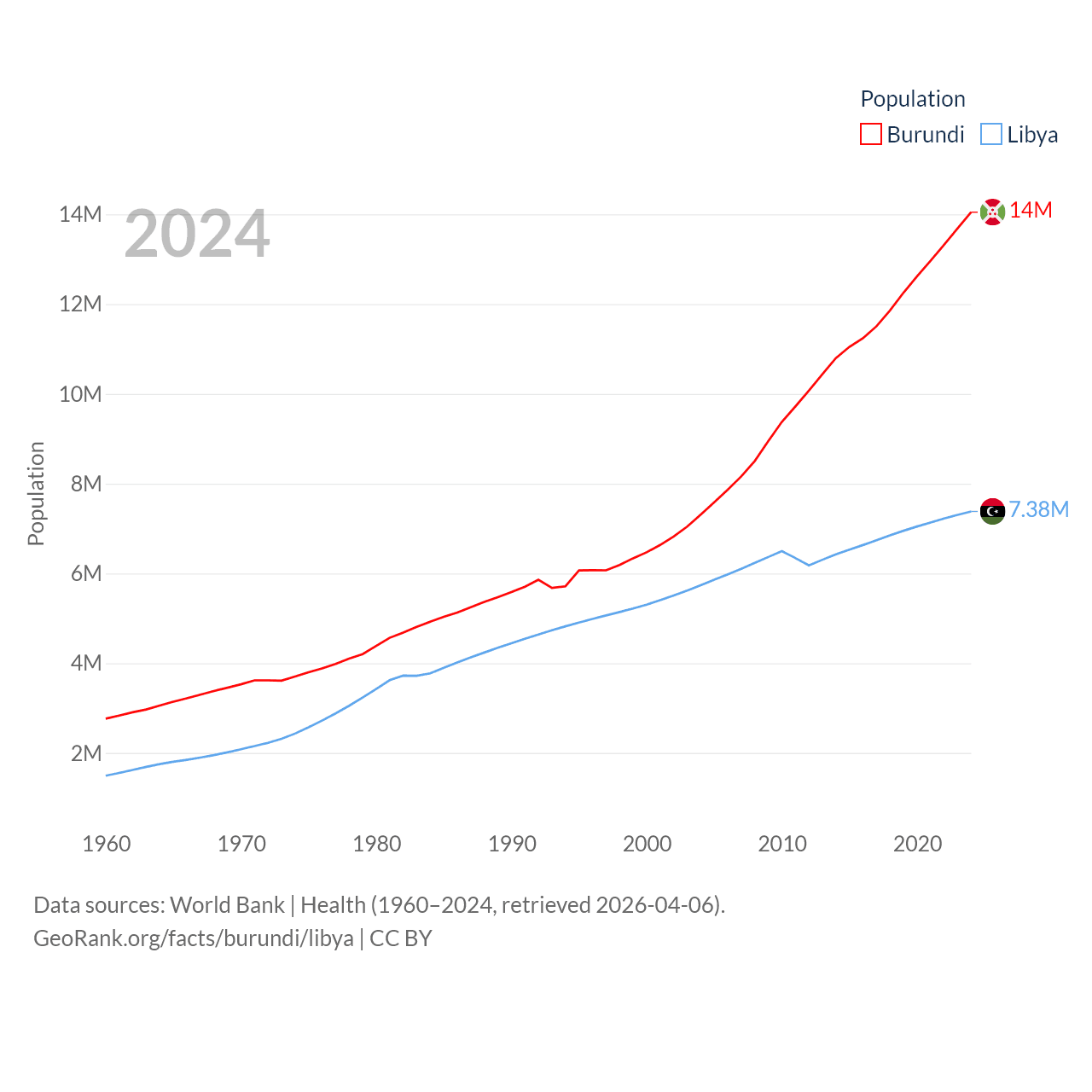 Burundi has a population of 14M (ranked 78/197), compared with 7.38M in Libya (ranked 105/197). Burundi's land area is 9,915 sq mi versus 679,362 sq mi for Libya (ranked 144th vs. 16th).