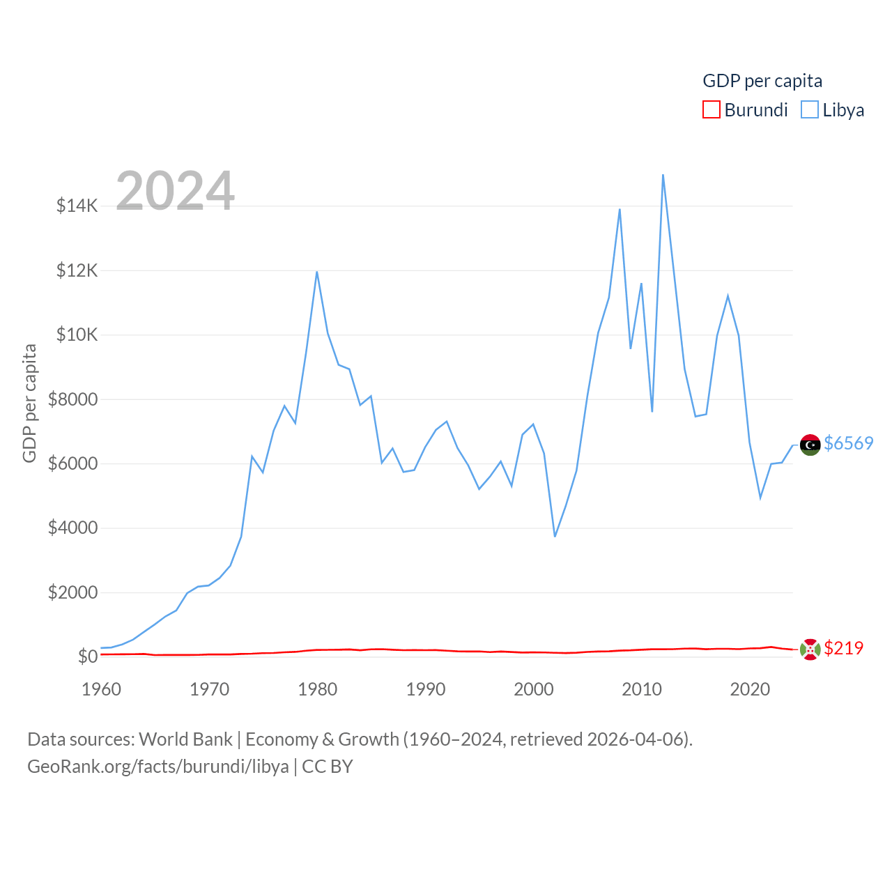 By GDP, Burundi ranks 169/197 ($3.08B) and Libya ranks 95/197 ($48.5B). By GDP per capita, Burundi ranks 197/197 ($219.4), while Libya ranks 107/197 ($6,569).