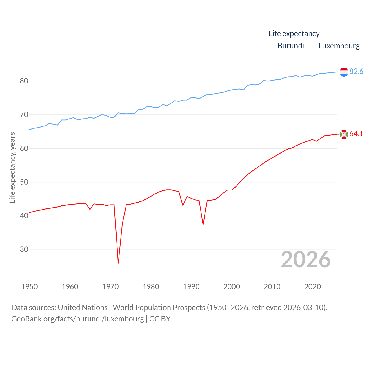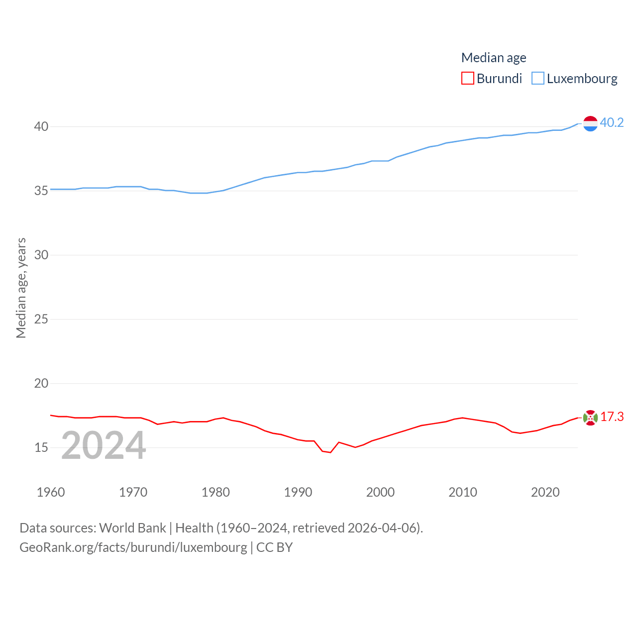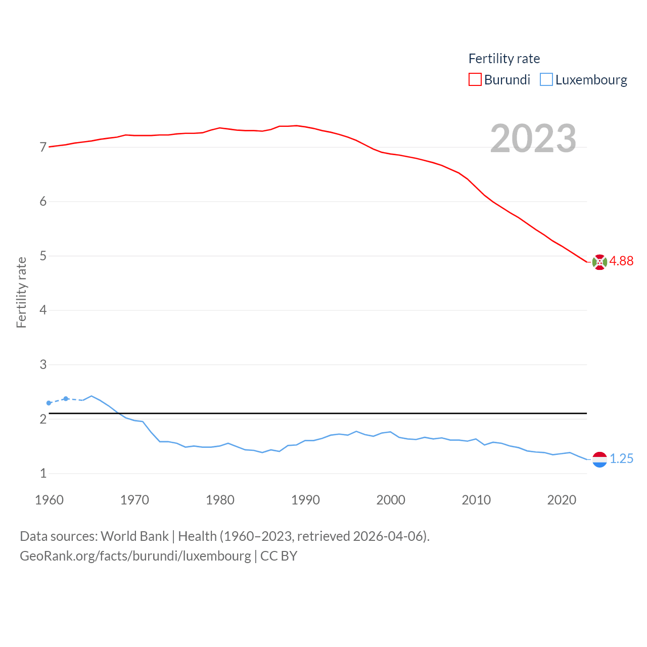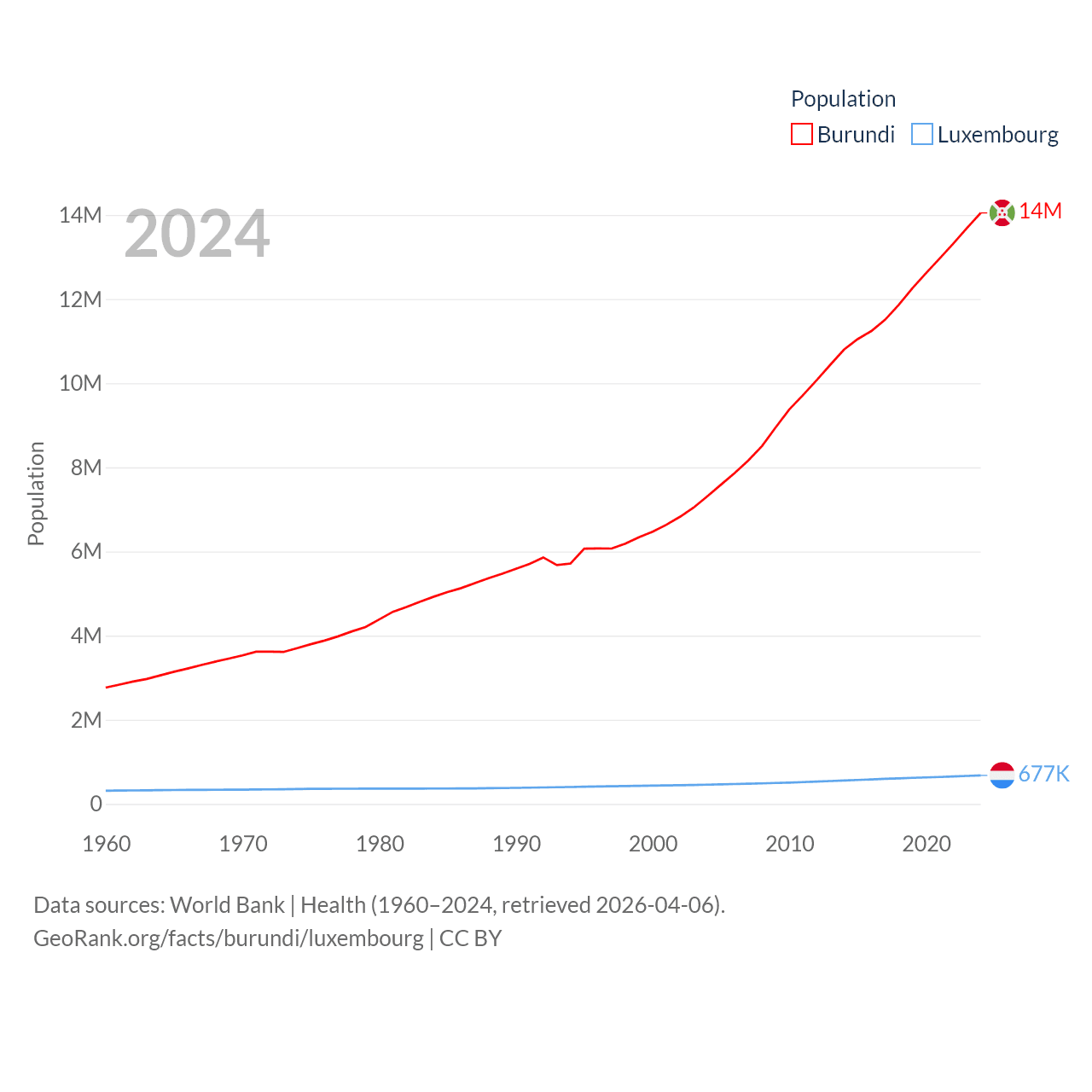 Burundi has a population of 14M (ranked 78/197), compared with 677K in Luxembourg (ranked 164/197). Burundi's land area is 9,915 sq mi versus 994 sq mi for Luxembourg (ranked 144th vs. 169th).