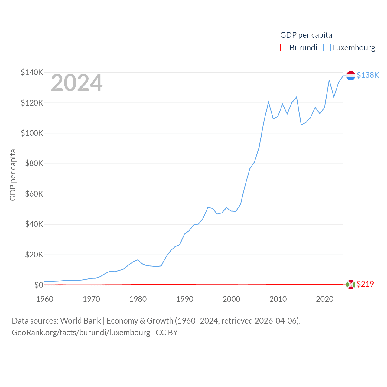 By GDP, Burundi ranks 169/197 ($3.08B) and Luxembourg ranks 74/197 ($93.3B). By GDP per capita, Burundi ranks 197/197 ($219.4), while Luxembourg ranks 3/197 ($137,782).
