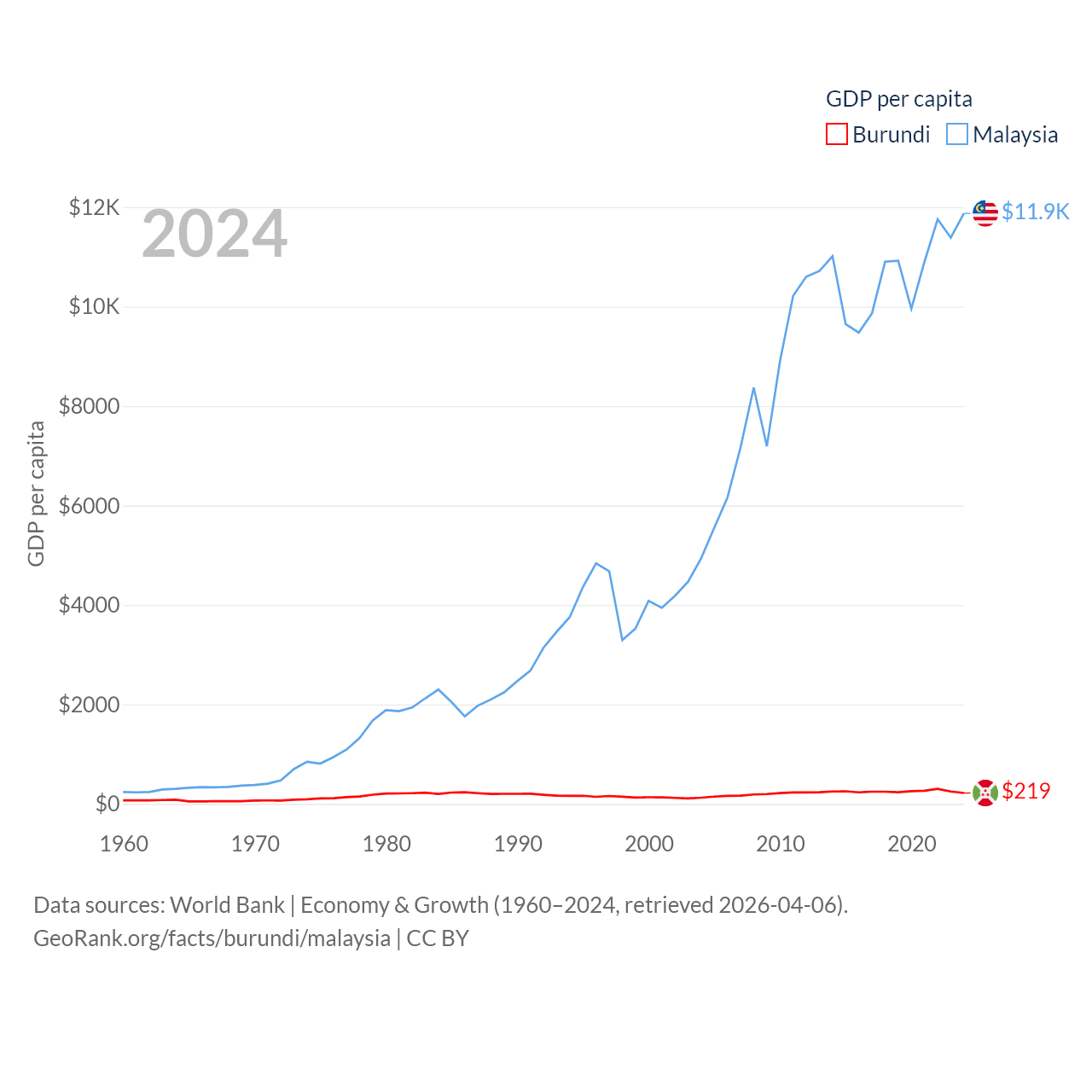 By GDP, Burundi ranks 169/197 ($3.08B) and Malaysia ranks 38/197 ($422B). By GDP per capita, Burundi ranks 197/197 ($219.4), while Malaysia ranks 79/197 ($11,874).