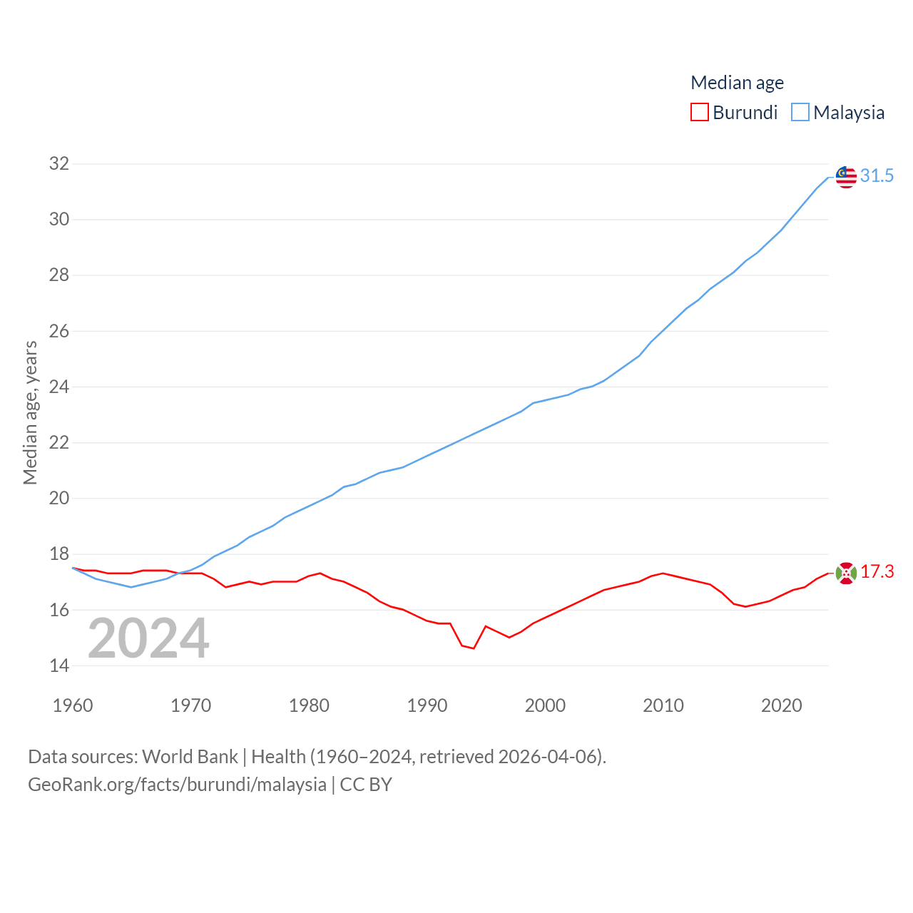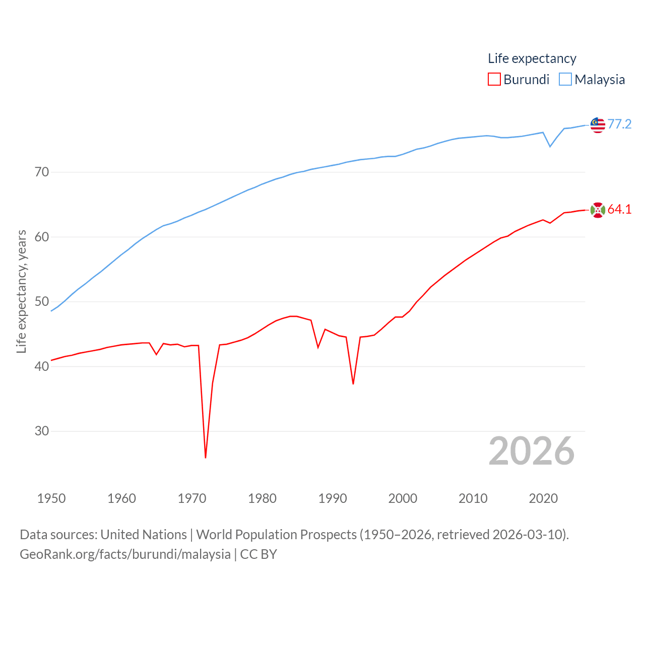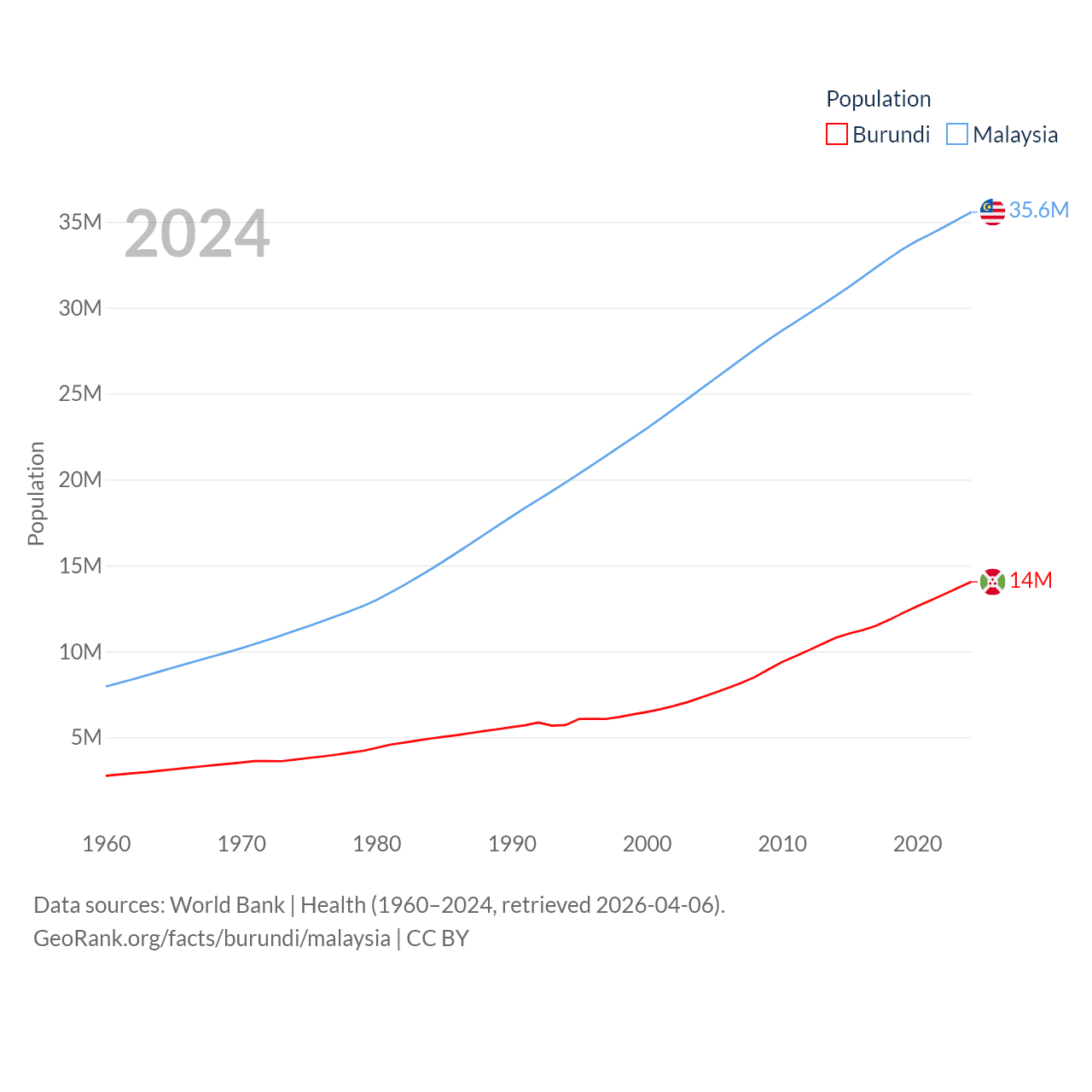 Burundi has a population of 14M (ranked 78/197), compared with 35.6M in Malaysia (ranked 44/197). Burundi's land area is 9,915 sq mi versus 126,854 sq mi for Malaysia (ranked 144th vs. 65th).