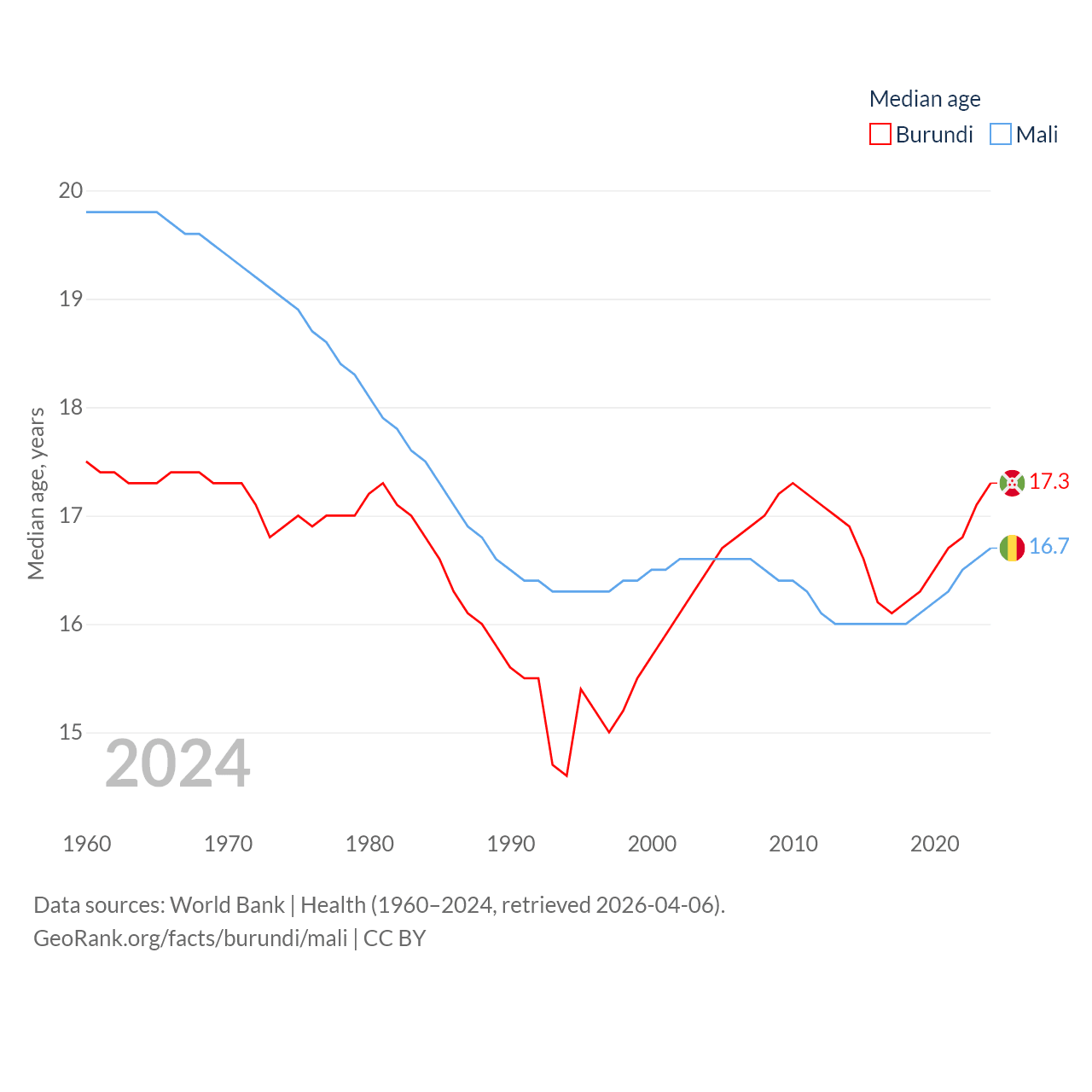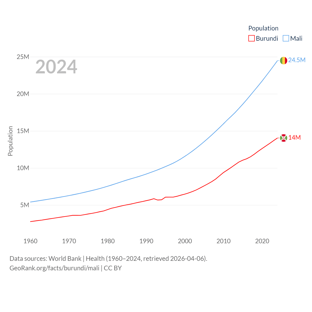 Burundi has a population of 14M (ranked 78/197), compared with 24.5M in Mali (ranked 58/197). Burundi's land area is 9,915 sq mi versus 471,118 sq mi for Mali (ranked 144th vs. 23rd).