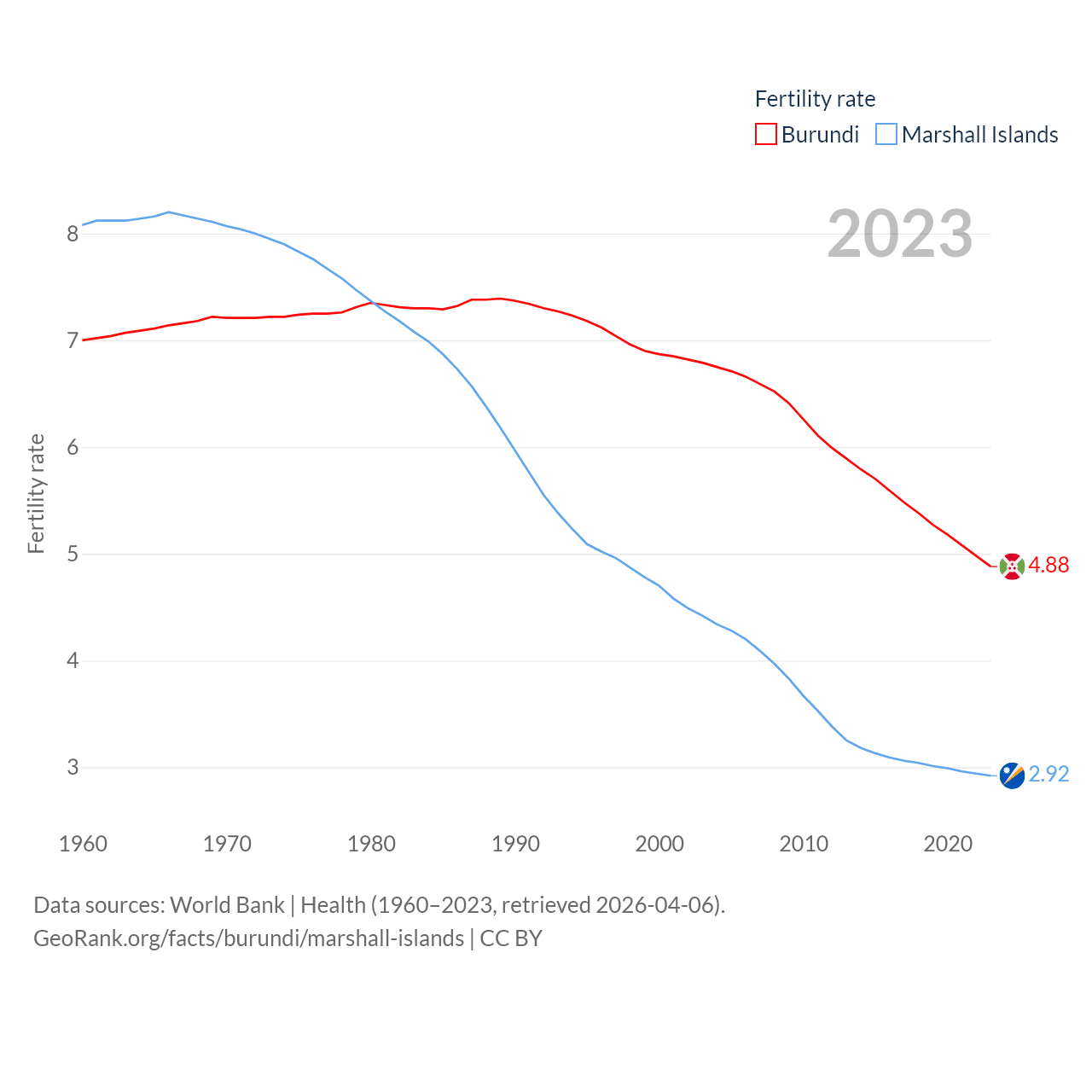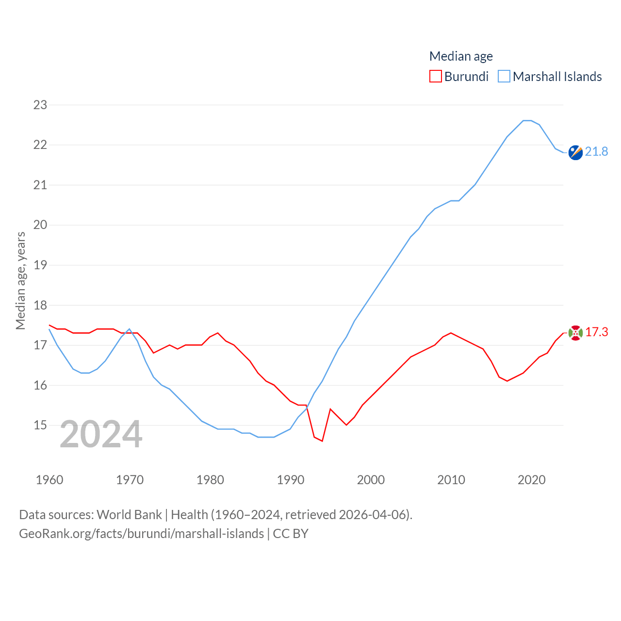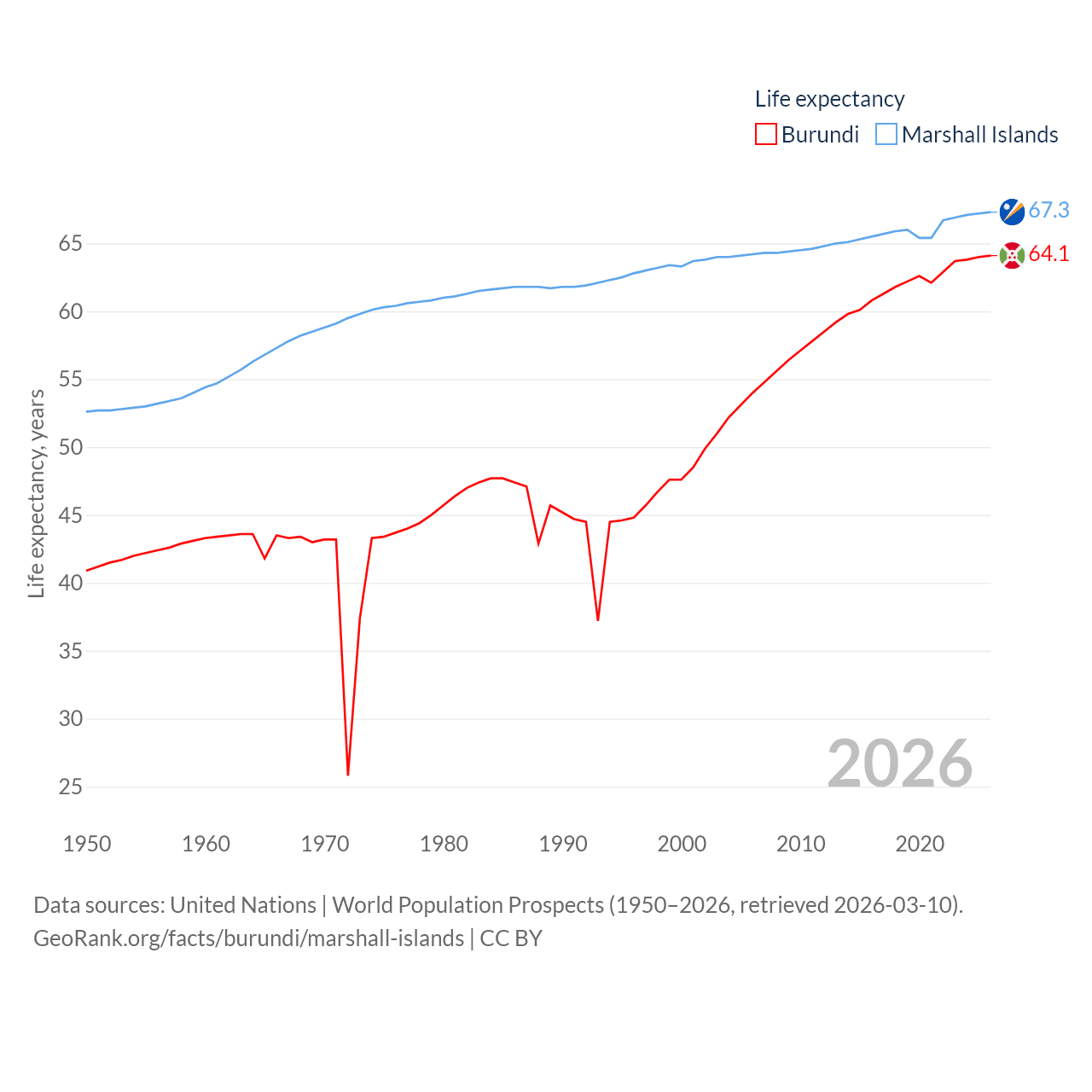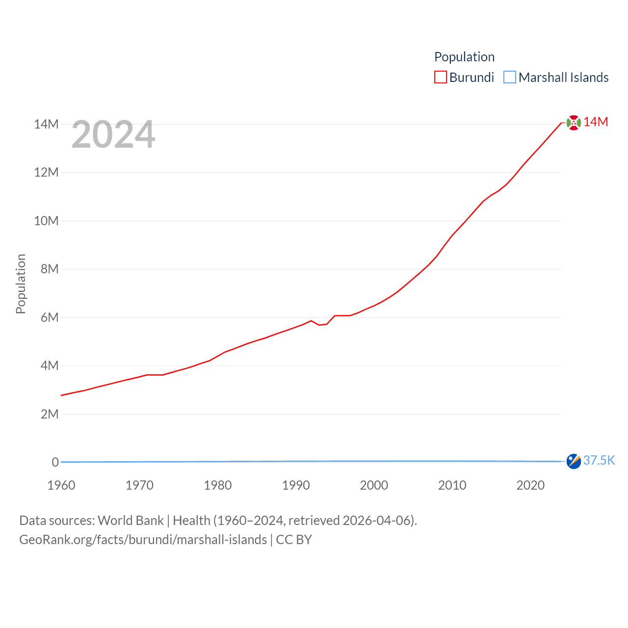 Burundi has a population of 14M (ranked 78/197), compared with 37.5K in The Marshall Islands (ranked 192/197). Burundi's land area is 9,915 sq mi versus 69.5 sq mi for The Marshall Islands (ranked 144th vs. 191st).