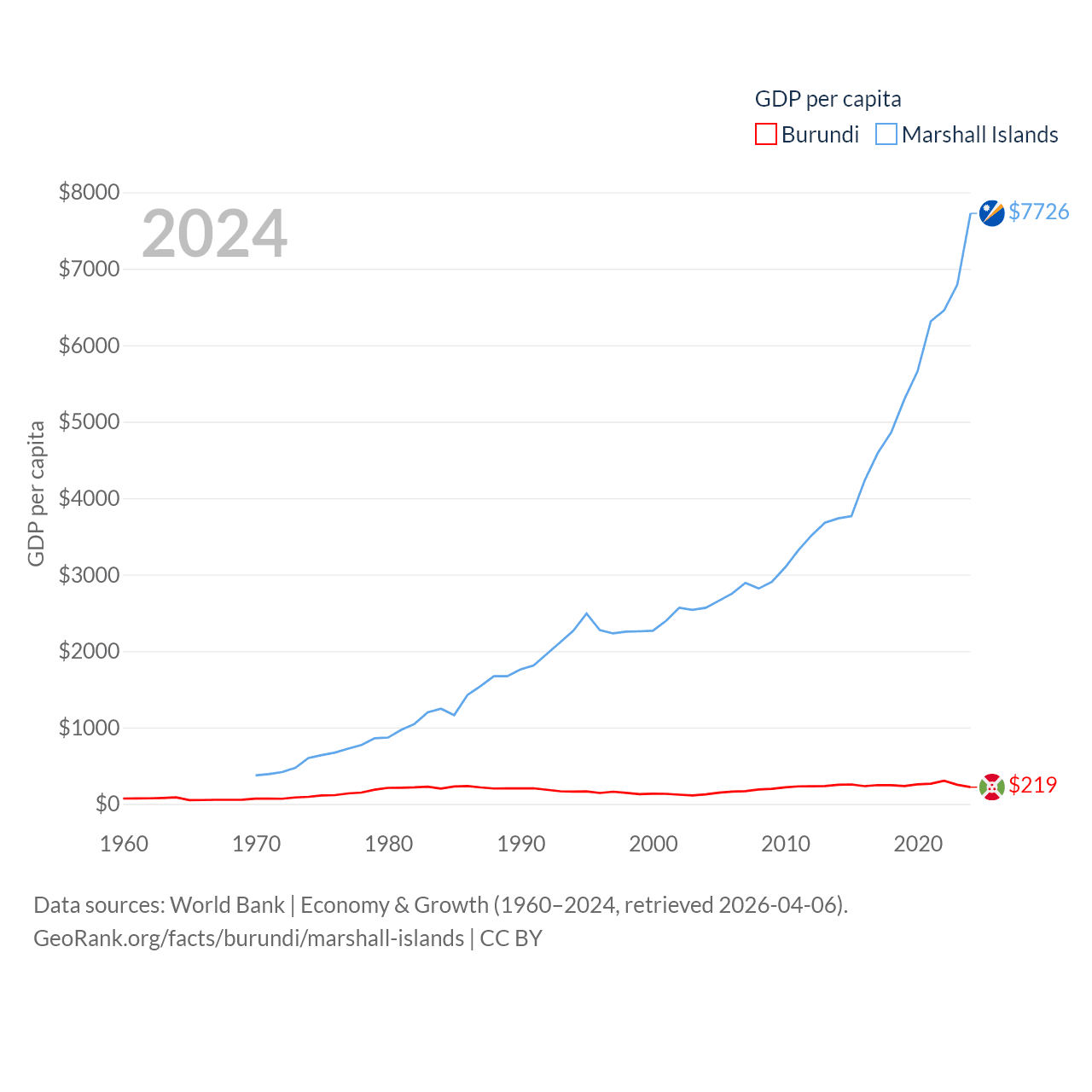 By GDP, Burundi ranks 169/197 ($3.08B) and The Marshall Islands ranks 193/197 ($290M). By GDP per capita, Burundi ranks 197/197 ($219.4), while The Marshall Islands ranks 96/197 ($7,726).