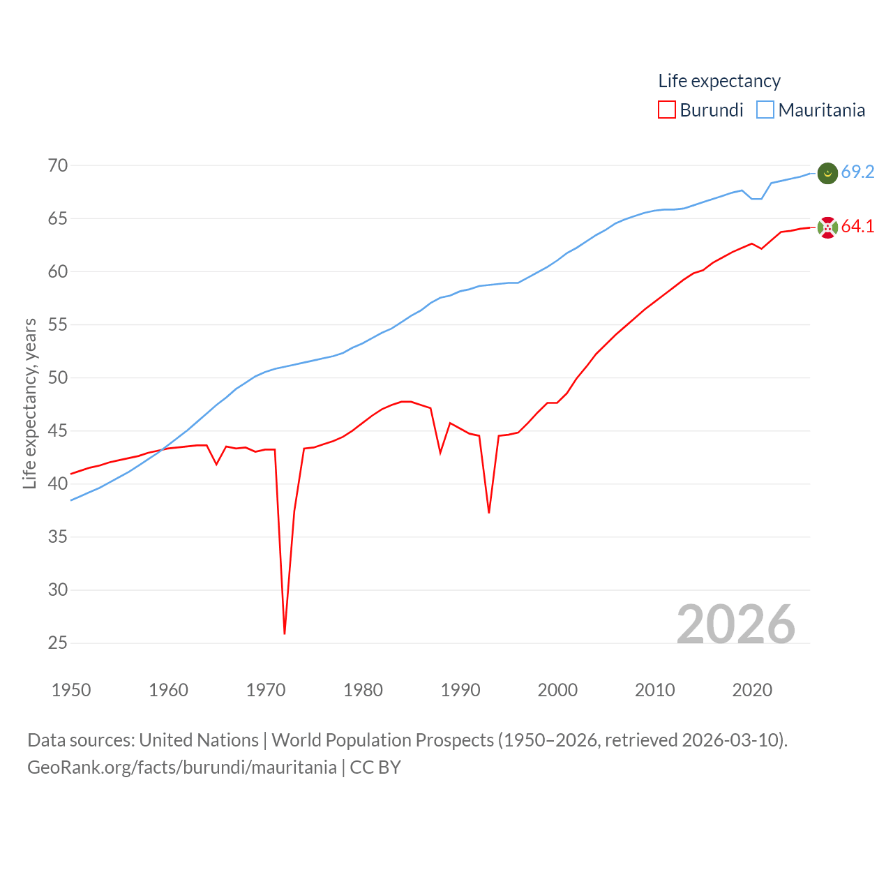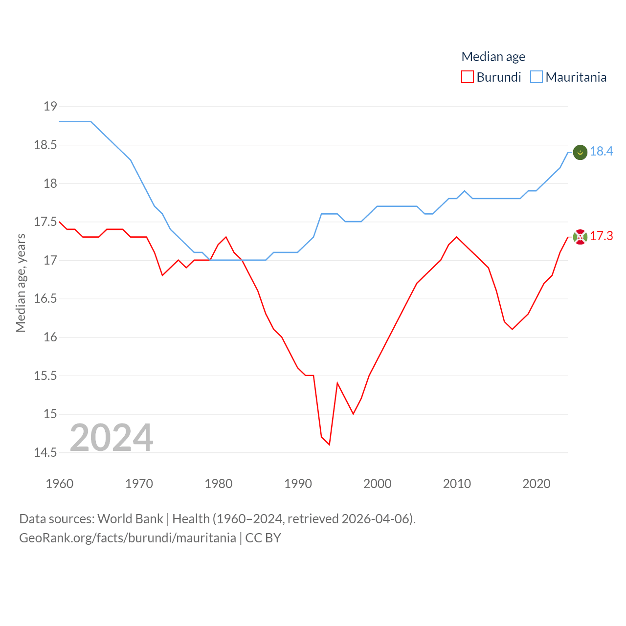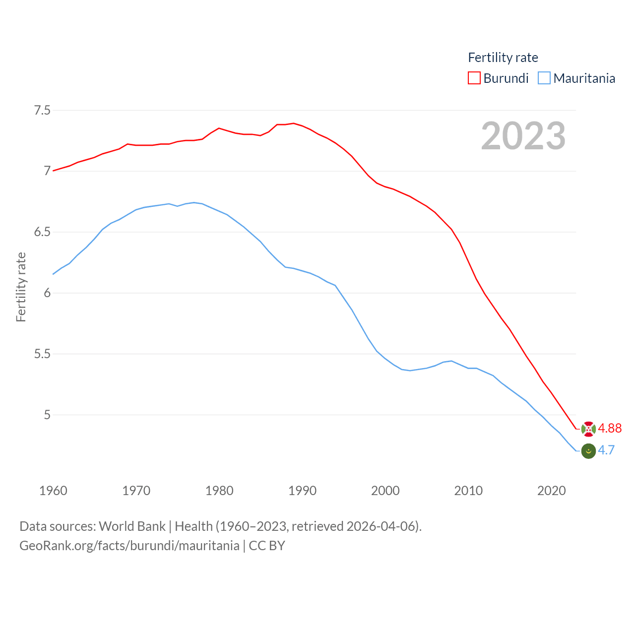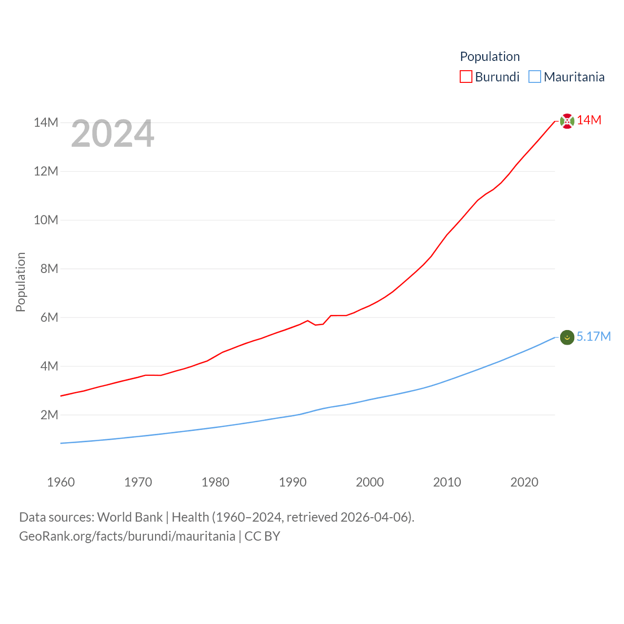 Burundi has a population of 14M (ranked 78/197), compared with 5.17M in Mauritania (ranked 125/197). Burundi's land area is 9,915 sq mi versus 397,955 sq mi for Mauritania (ranked 144th vs. 28th).