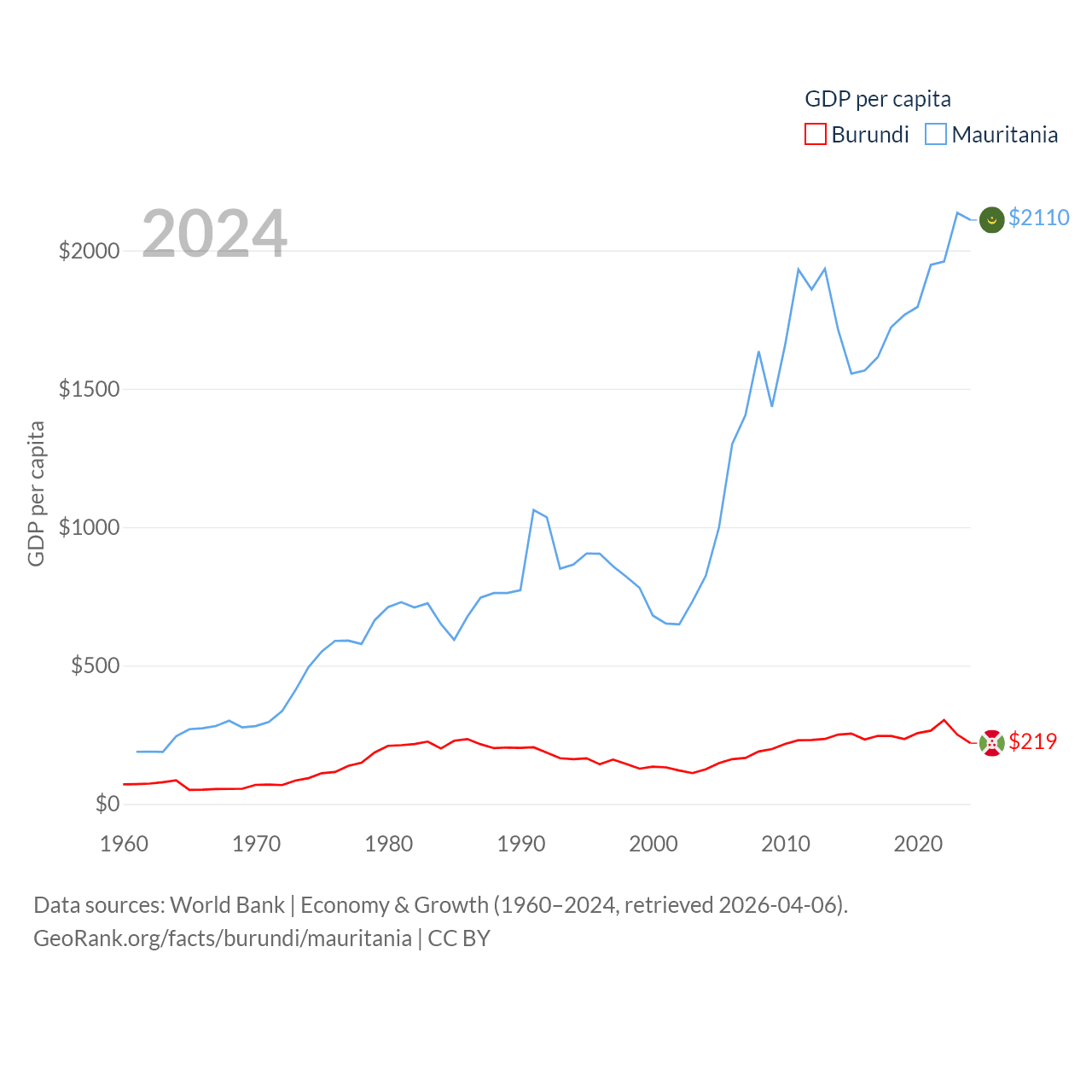 By GDP, Burundi ranks 169/197 ($3.08B) and Mauritania ranks 153/197 ($10.9B). By GDP per capita, Burundi ranks 197/197 ($219.4), while Mauritania ranks 156/197 ($2,110).