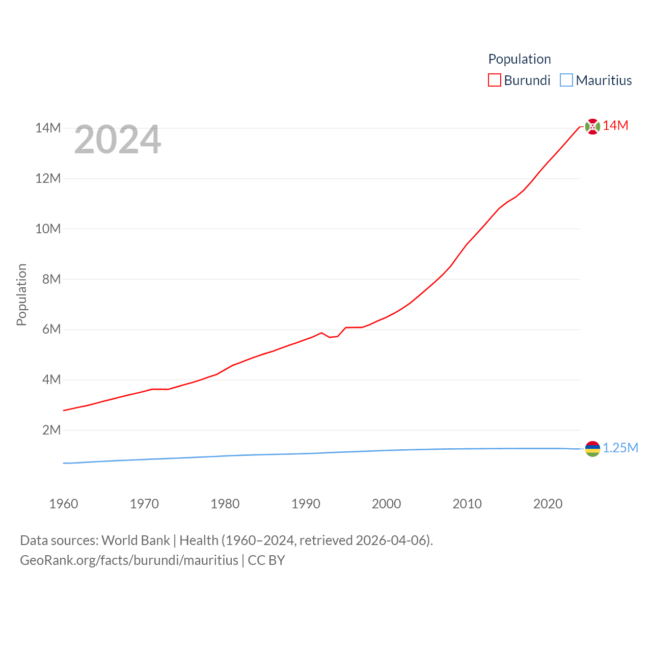 Burundi has a population of 14M (ranked 78/197), compared with 1.25M in Mauritius (ranked 156/197). Burundi's land area is 9,915 sq mi versus 771 sq mi for Mauritius (ranked 144th vs. 170th).