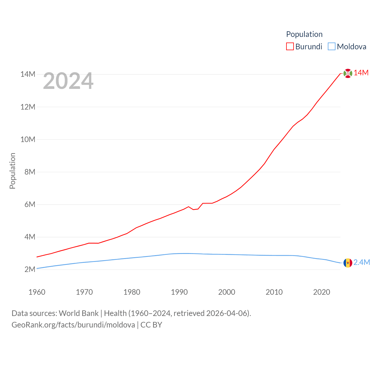 Burundi has a population of 14M (ranked 78/197), compared with 2.4M in Moldova (ranked 143/197). Burundi's land area is 9,915 sq mi versus 12,714 sq mi for Moldova (ranked 144th vs. 135th).