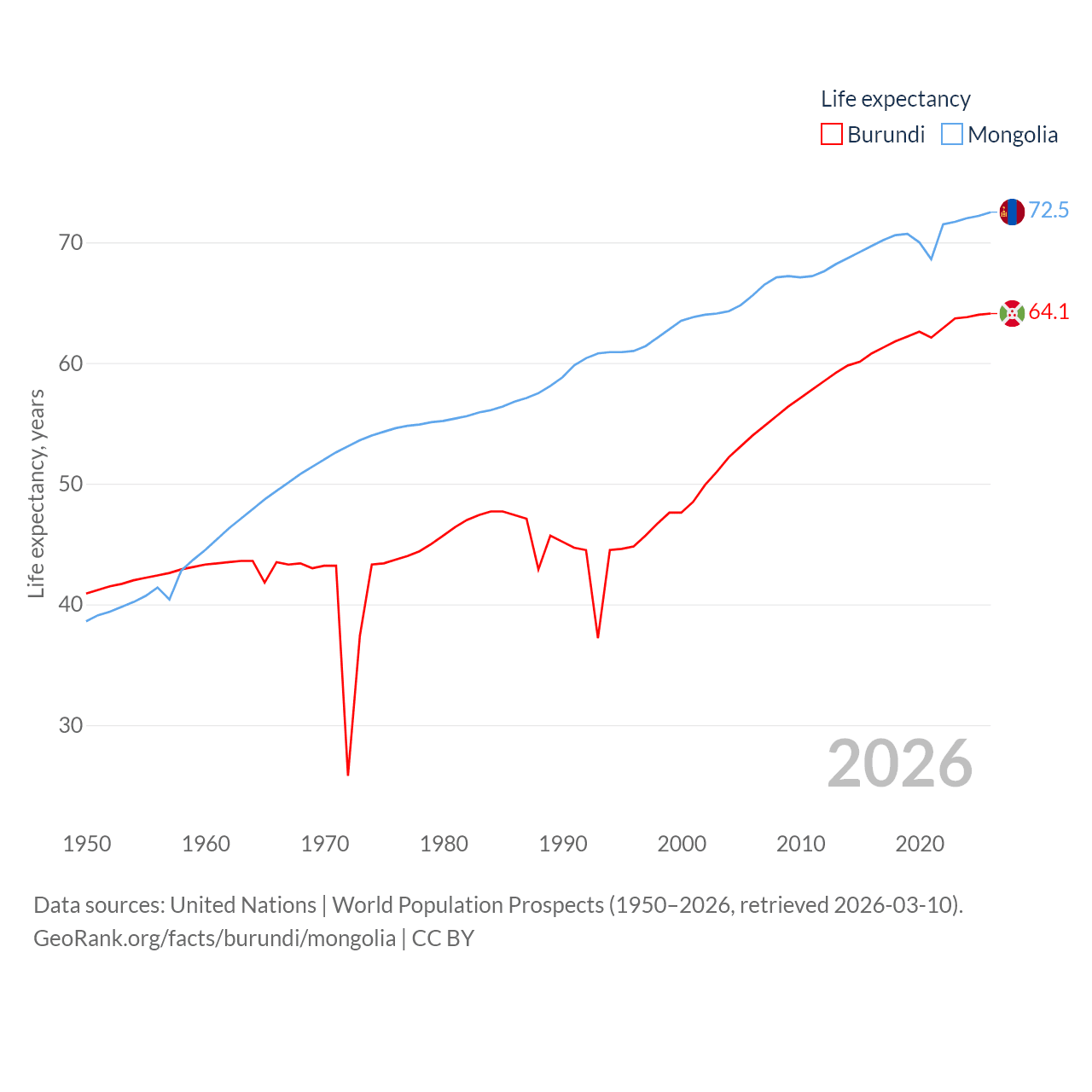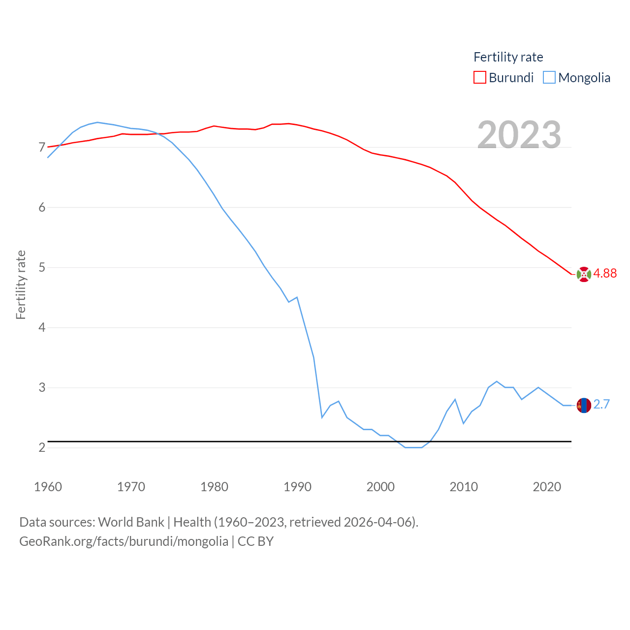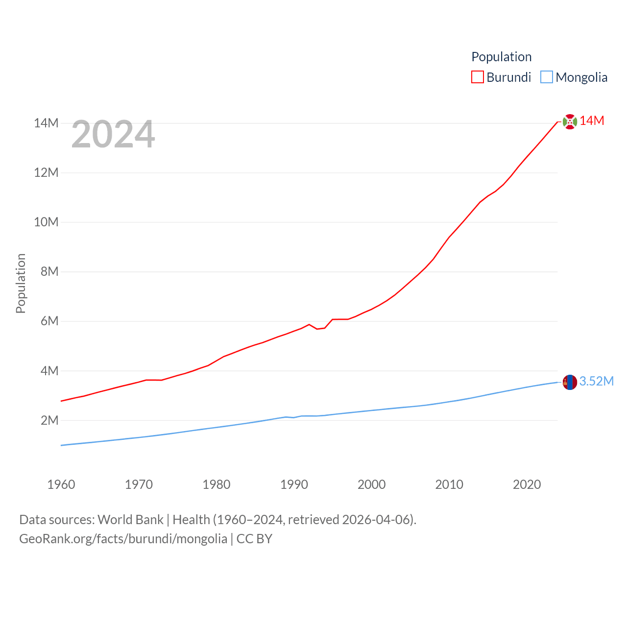 Burundi has a population of 14M (ranked 78/197), compared with 3.52M in Mongolia (ranked 132/197). Burundi's land area is 9,915 sq mi versus 601,740 sq mi for Mongolia (ranked 144th vs. 18th).