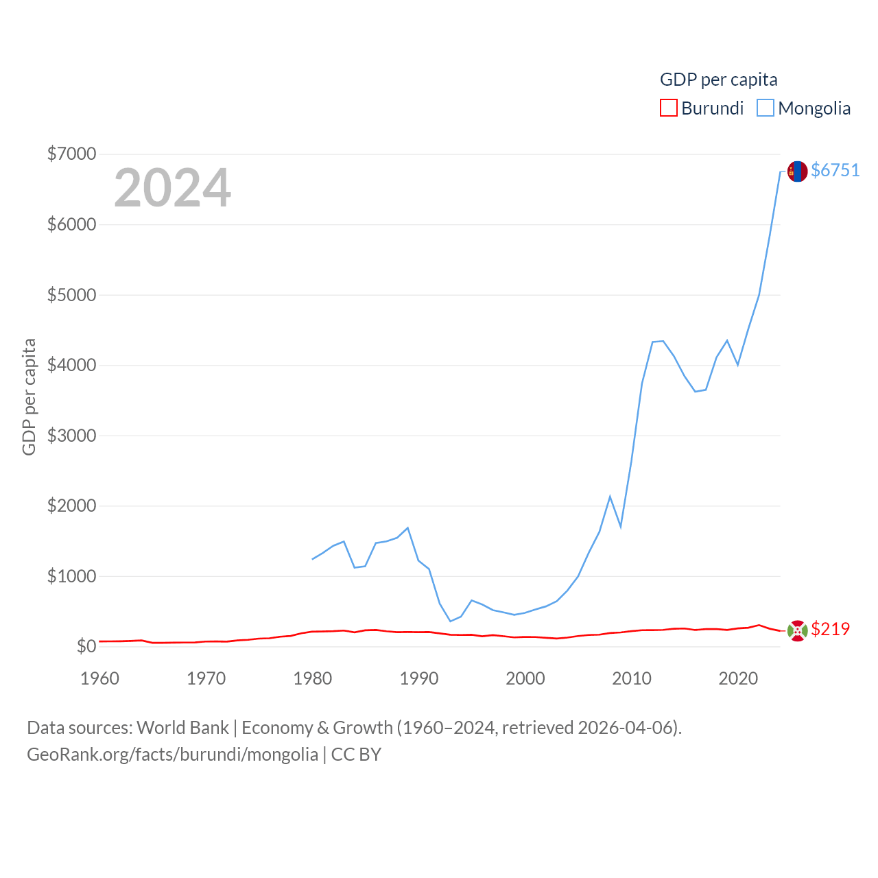 By GDP, Burundi ranks 169/197 ($3.08B) and Mongolia ranks 121/197 ($23.8B). By GDP per capita, Burundi ranks 197/197 ($219.4), while Mongolia ranks 105/197 ($6,751).